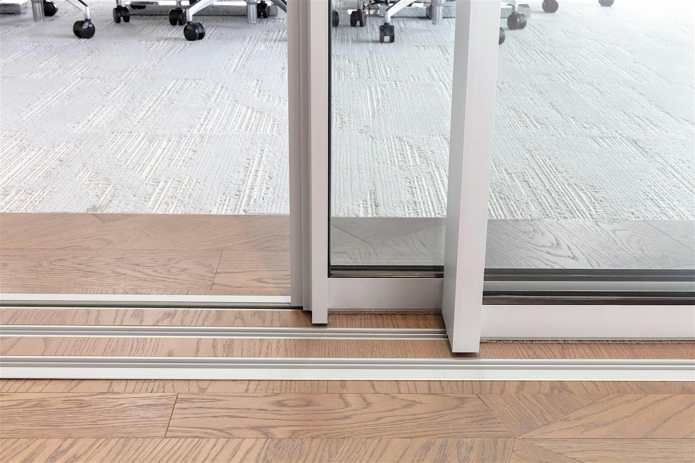 The glass wall system is made of individual panels, each running along a single track and providing effortless design flexibility.