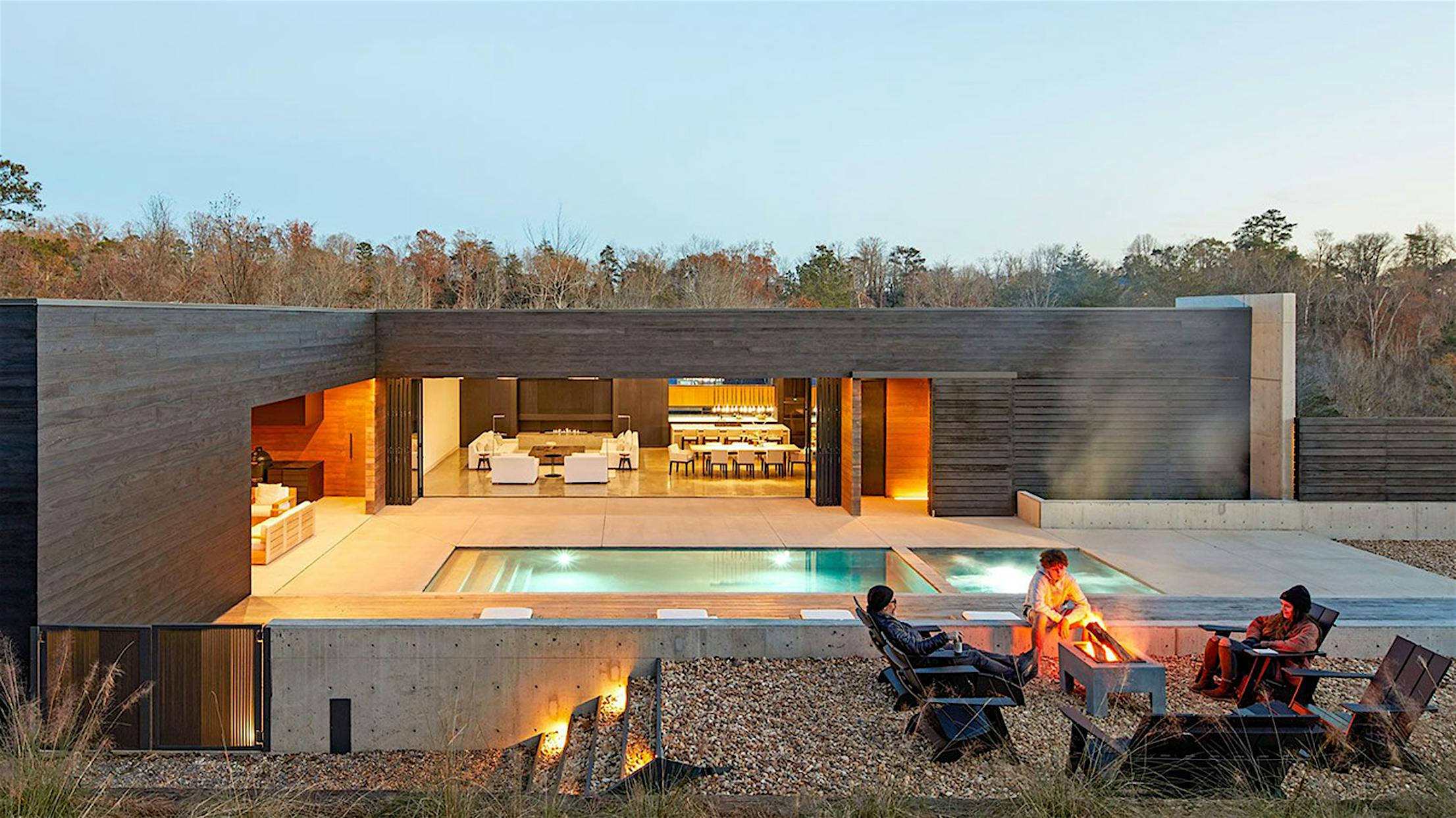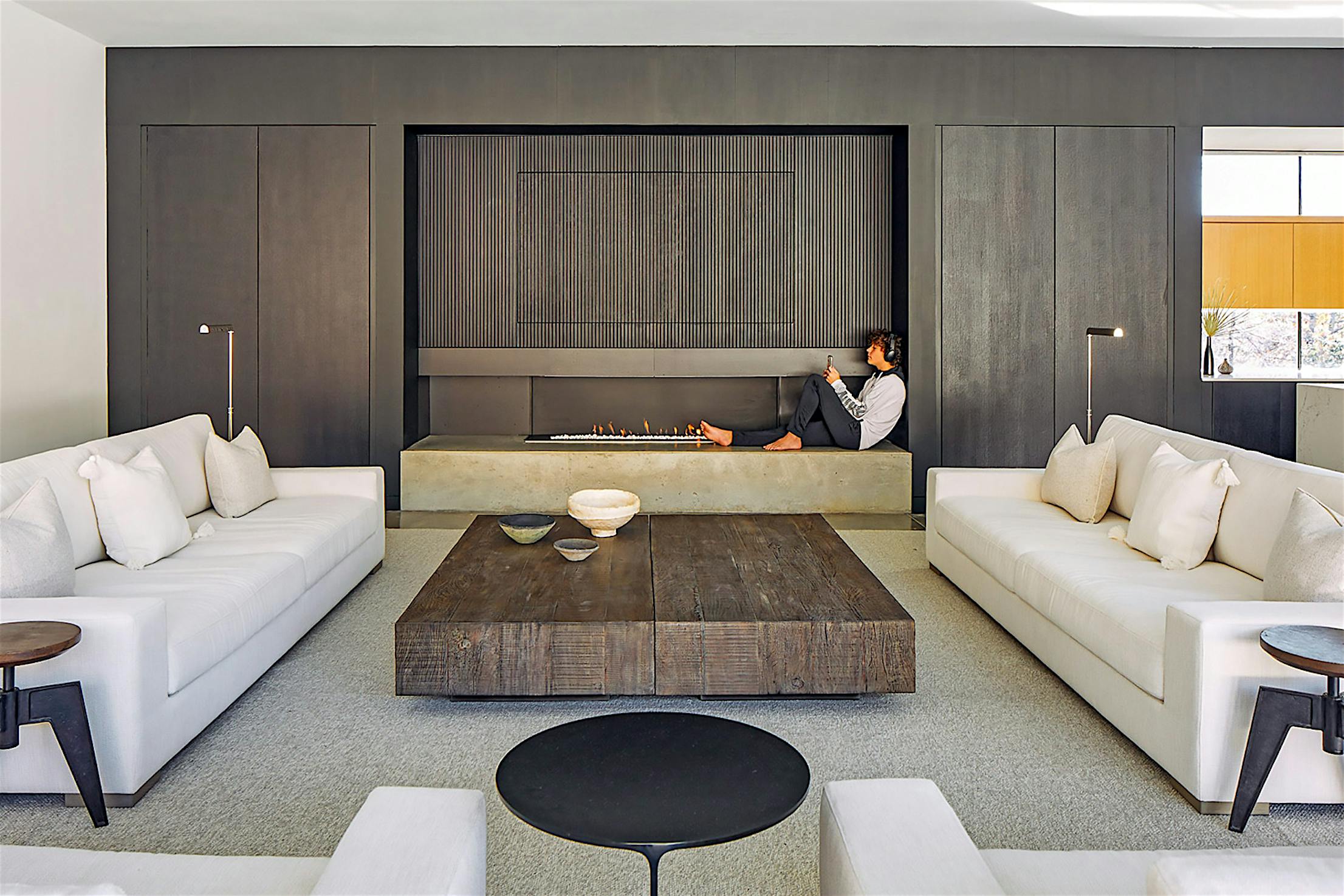 The openness of the great room is emphasized by it being conceptually part of the exterior, with shou sugi ban appearing on the walls and even the cocktail table. Cut into one dark wall is a restaurant-booth nook of warm cedar, aligned with the large dining table in the center of the room. In the living room section, Gibson explains, “the polished concrete floors turns up and becomes this poured-in-place solid hearth, which has a linear fireplace that doesn’t look like a fireplace.” Paneled with shou sugi ban, the back wall of the fireplace conceals a fold-out TV screen, the perfect contemporary analogy for the traditional fireplace.