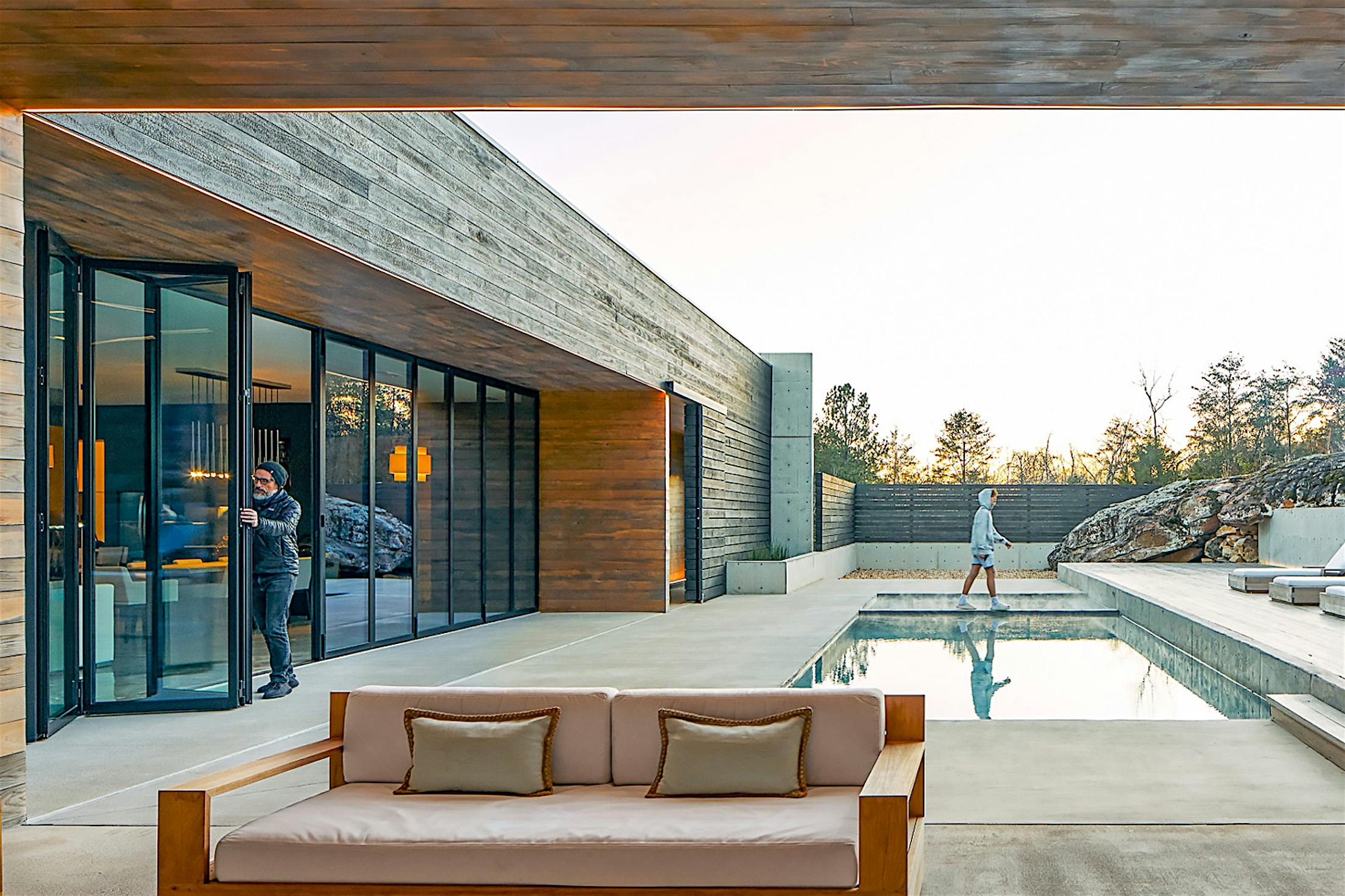 It started with a rock. The clients—both C-suite marketing professionals with major Alabama companies—fell in love with a property that is dominated by a large rock. This rambling, irregular outcropping of nature became the anchor for an ordered, rectilinear living space where outdoors melds into indoors, and a minimal vocabulary of materials becomes elegantly expressive. To top it all off, a NanaWall bifold glass door seamlessly connects the indoor living areas to the outdoor ones for a cohesive indoor/outdoor experience.