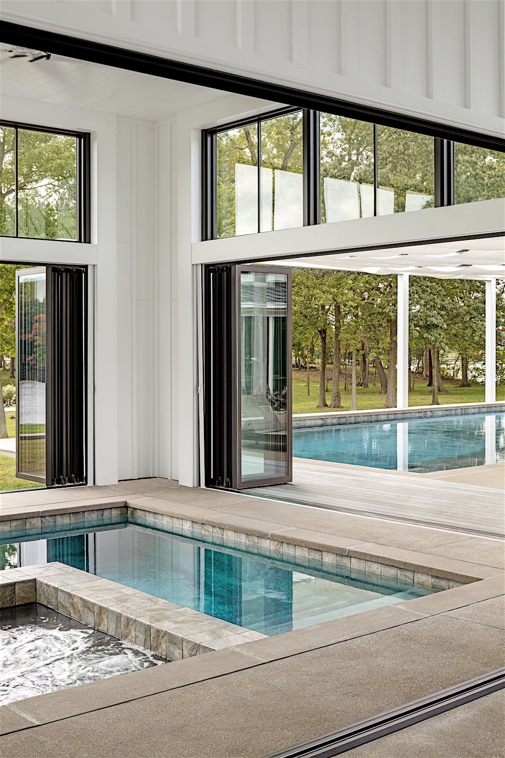 The NanaWall folding glass doors are aluminum framed systems designed for energy efficiency, ease of operation, and strong weather performance throughout the year. The narrow aluminum frames offer minimal sightlines and can be specified with swing panels for seamless indoor/outdoor transitions when the system is closed. The customizable black frames seamlessly blend with the rest of the home’s exterior fenestration and allow the family to enjoy the indoor pool even in the coldest winter.
