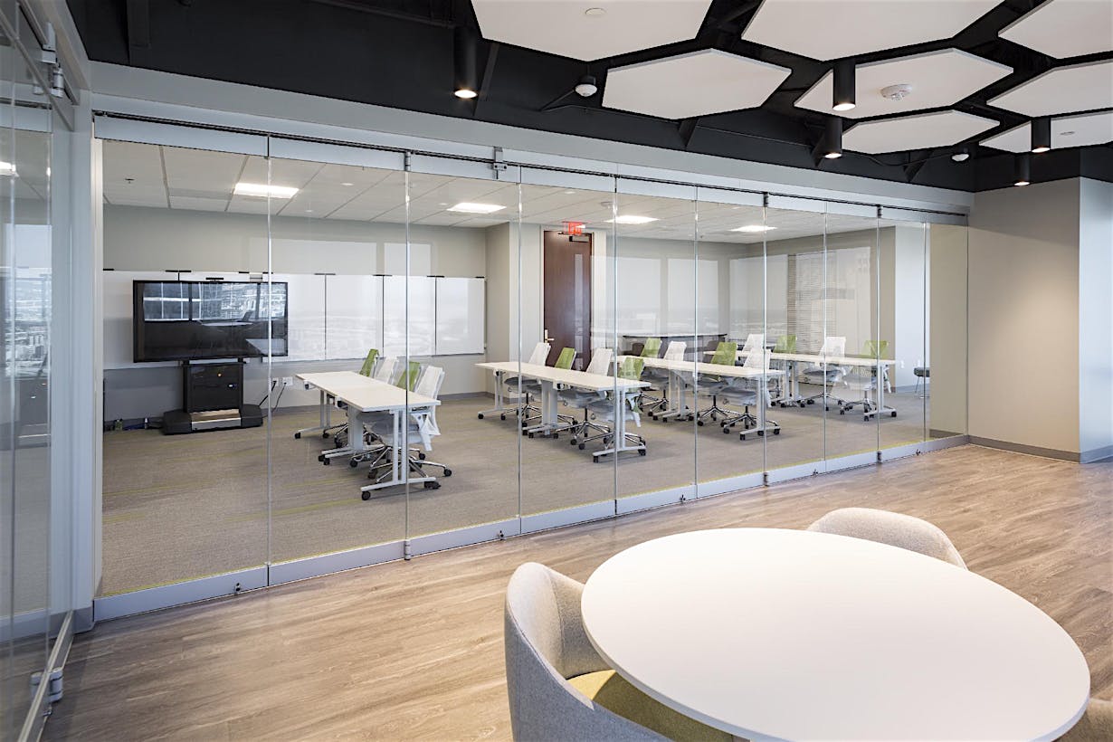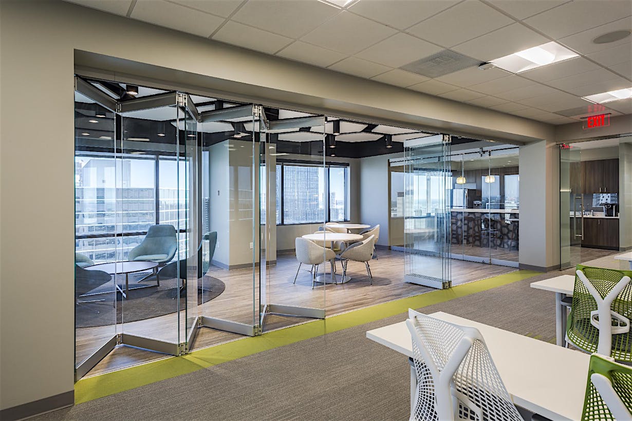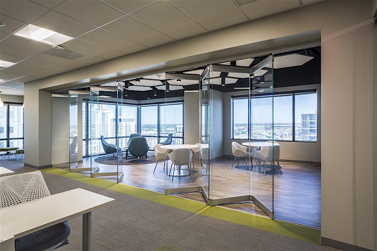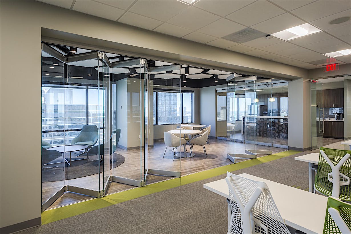 The flexible functionality was achieved by the NanaWall frameless all-glass wall, a folding center-pivot system (CSW75) with no floor-track whatsoever. In conference room mode, the wall is flat and completely transparent, with a swing door at one end. It is secured to the floor at small, discreet locking points. The frameless, all-glass look was one of the most attractive aspects for SK&A. To open the room, the wall folds up neatly to one side. In open mode, the center-pivot wall panels take up minimal space and the floor locking points are flush and unobtrusive.