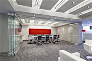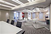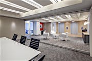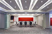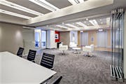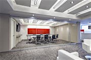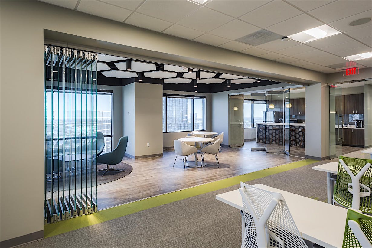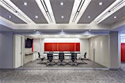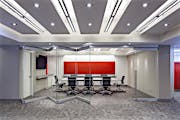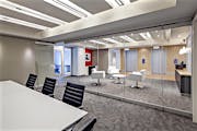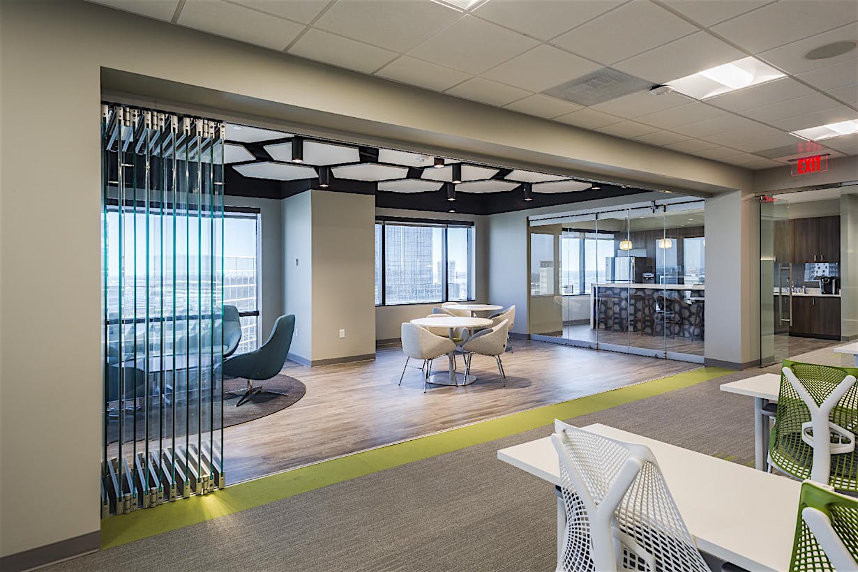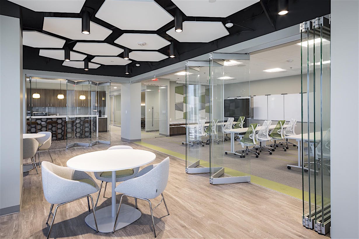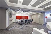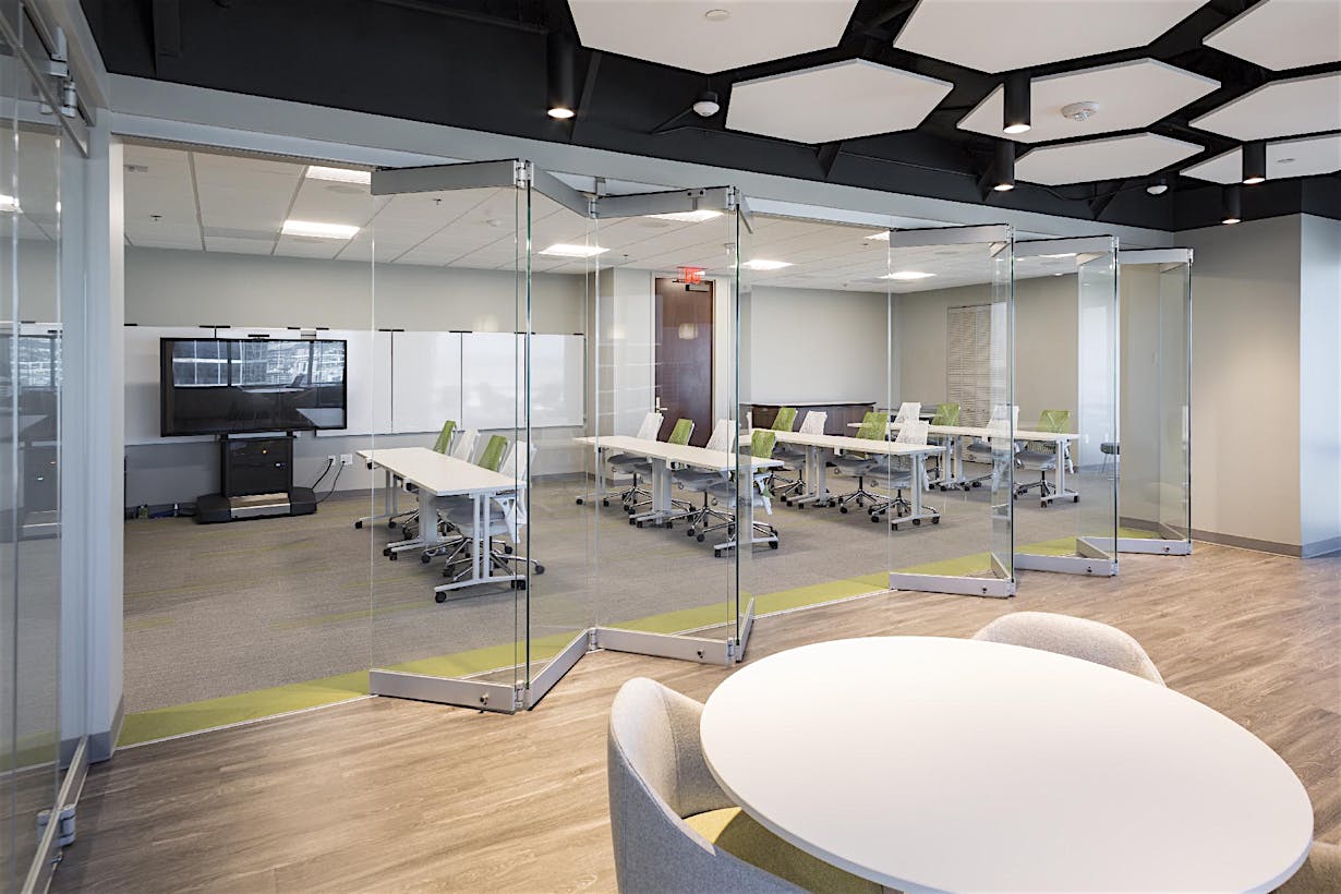 The flexible functionality was achieved by the NanaWall frameless all-glass wall, a folding center-pivot system (CSW75) with no floor-track whatsoever. In conference room mode, the wall is flat and completely transparent, with a swing door at one end. It is secured to the floor at small, discreet locking points. The frameless, all-glass look was one of the most attractive aspects for SK&A. To open the room, the wall folds up neatly to one side. In open mode, the center-pivot wall panels take up minimal space and the floor locking points are flush and unobtrusive.