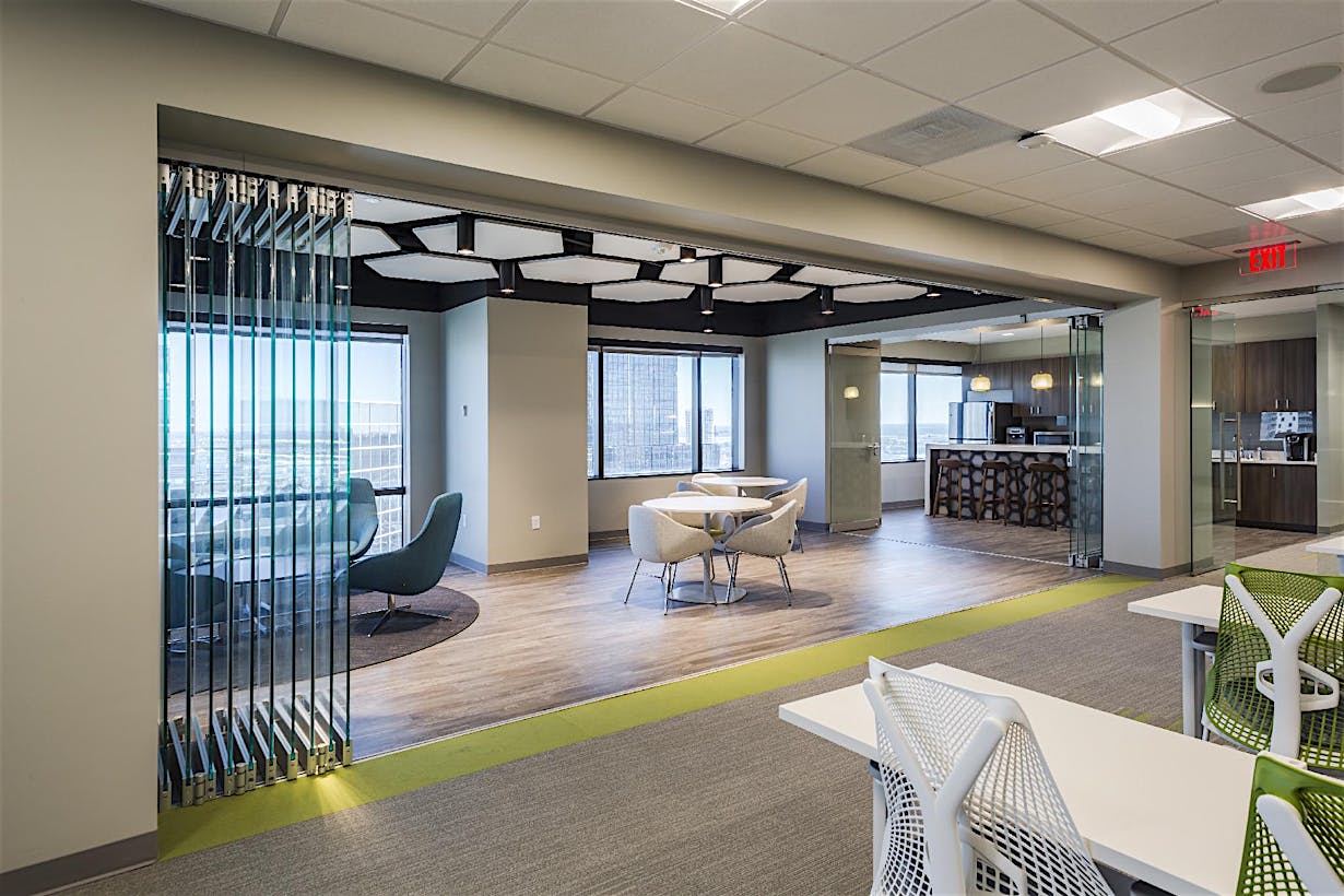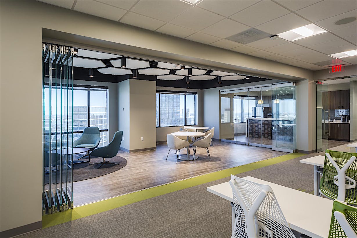 SK&A Structural Engineers, a well-established Washington DC engineering firm, saw an opportunity to expand and modernize their offices when their neighbors moved out, allowing SK&A to occupy an entire floor of the building. Their architect, MV+A Architects, leveraged the space of the elevator lobby and an existing conference room to create a flexible, versatile public-facing area for the company using an opening glass wall.