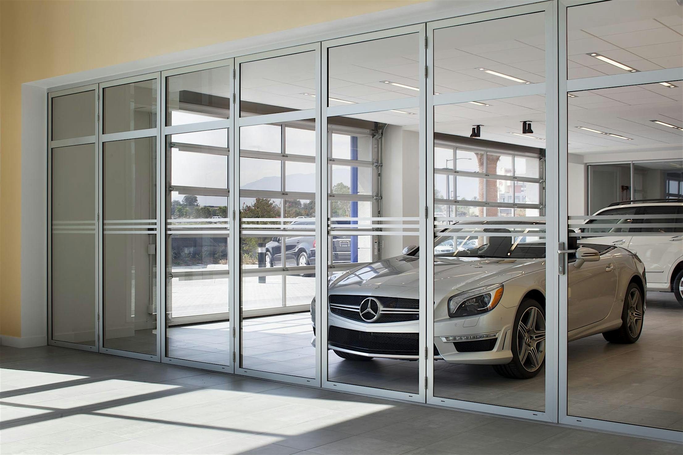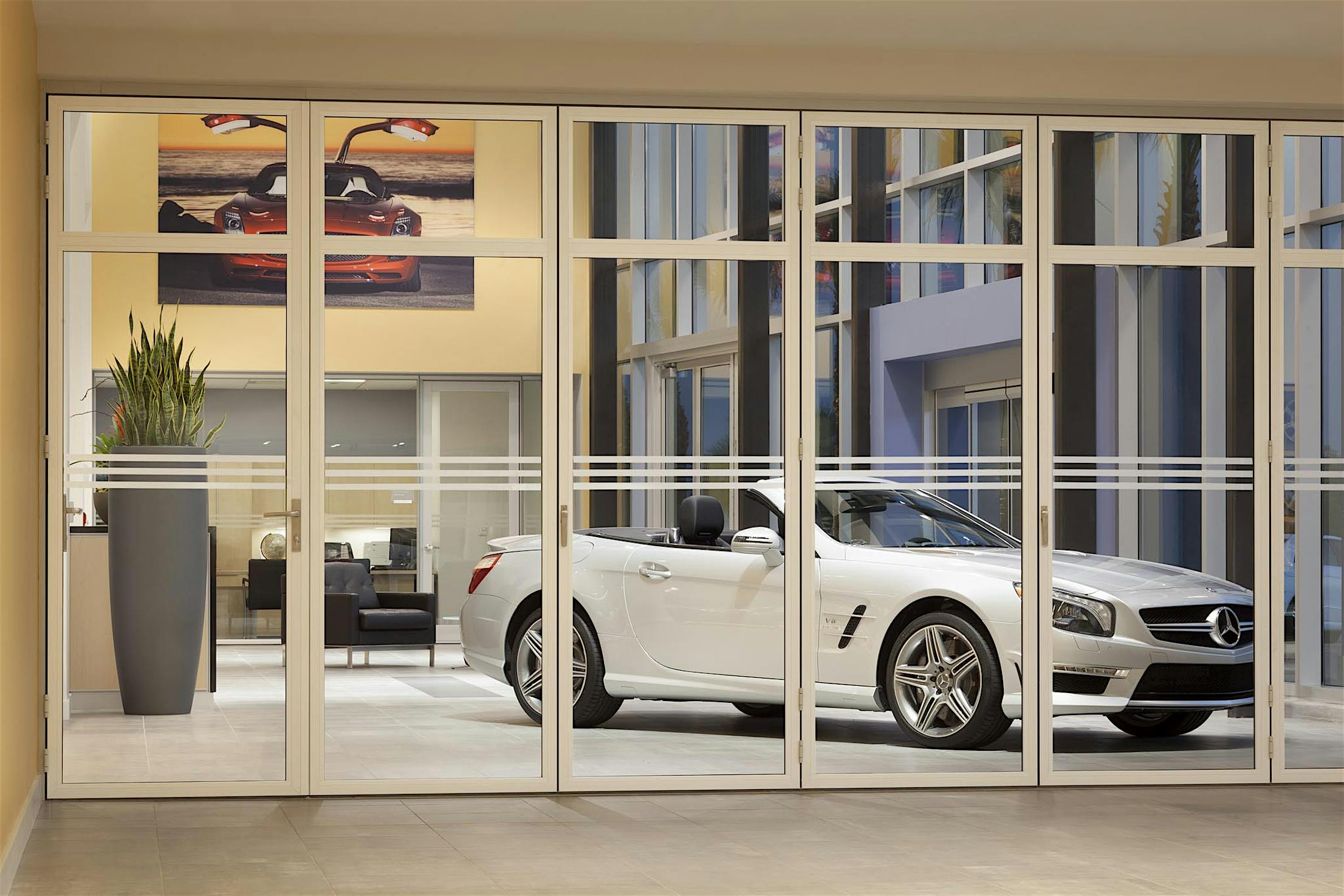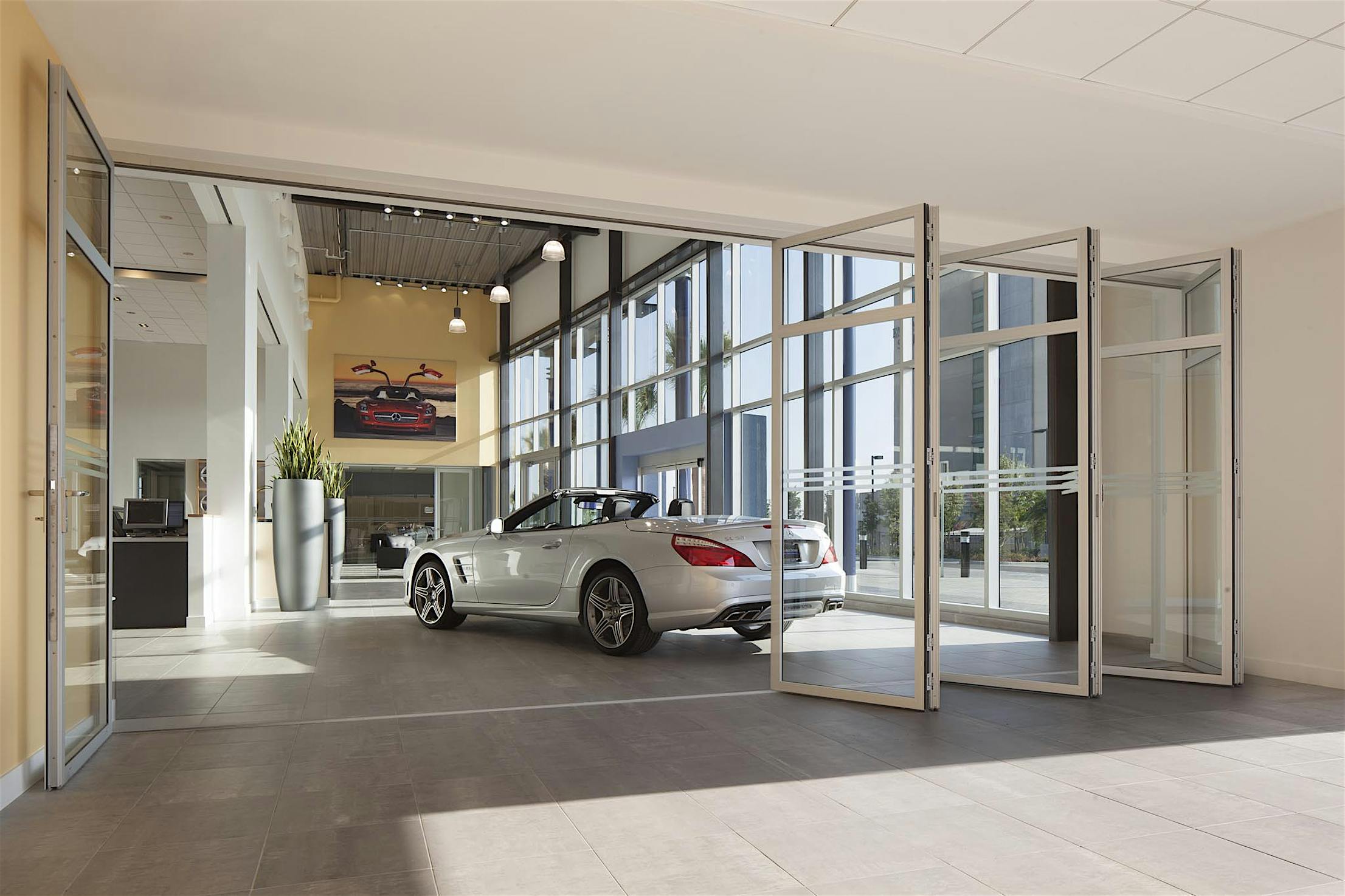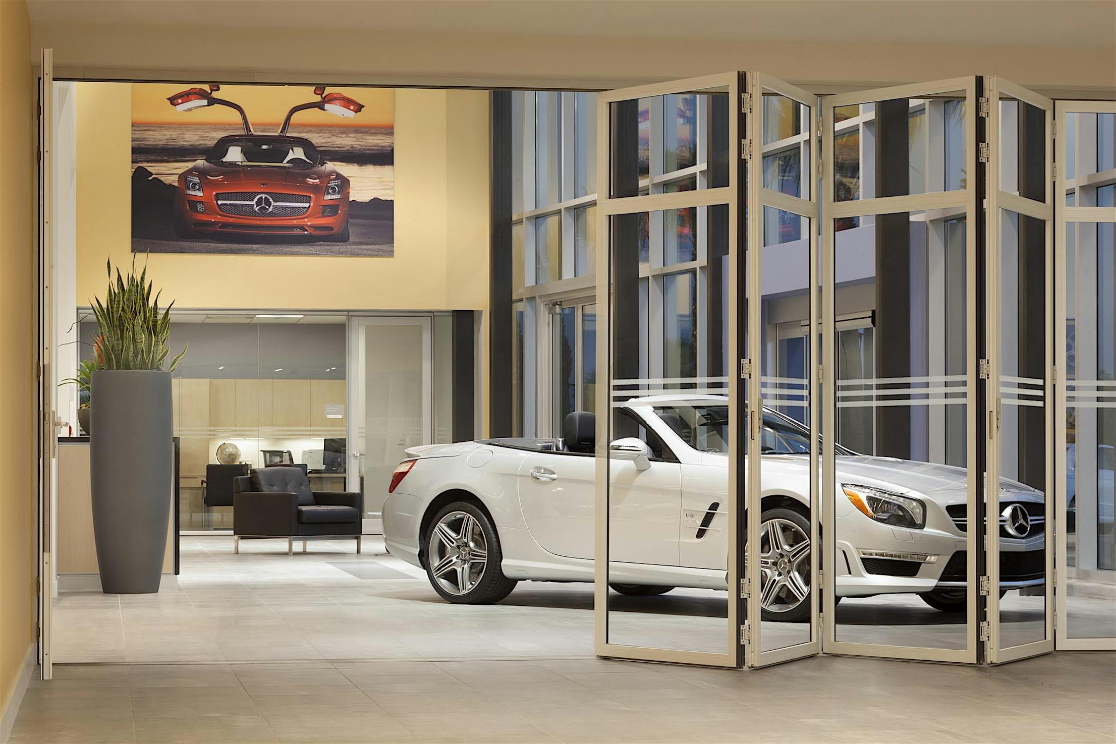 NanaWall commercial glass sliding door systems remove the physical and psychological barriers between clients and dream vehicles. Capture the expansive natural world beyond in one elegant and dramatic gesture.