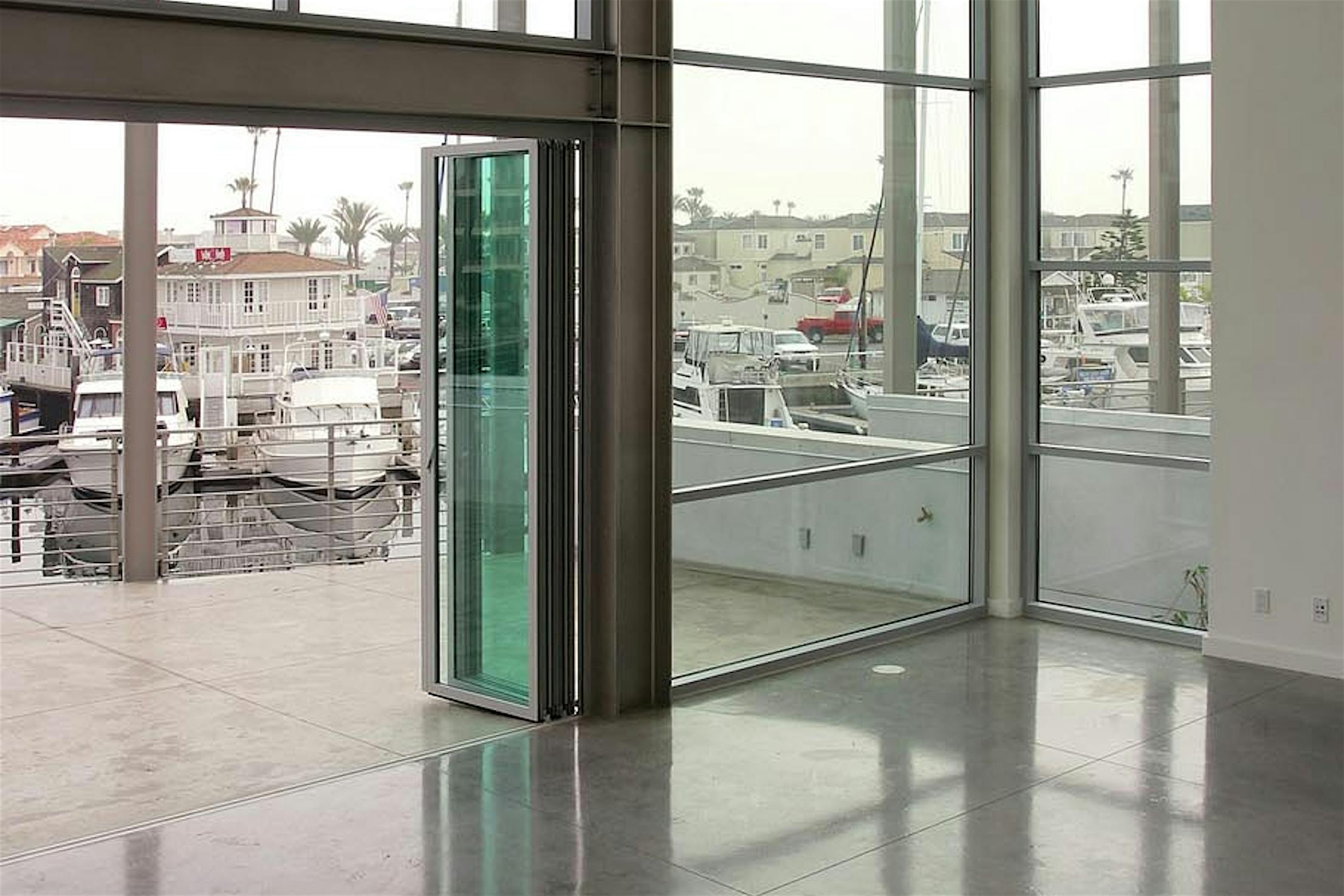 Each panel of the glass wall system is connected together along a single track and folds unto itself to create wide, unobstructed openings.