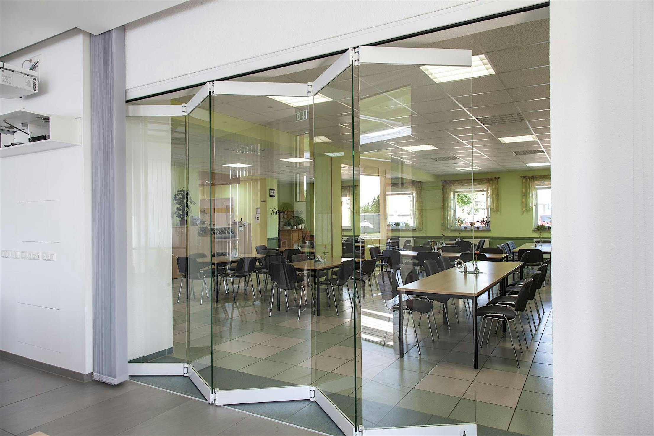 A single action swing panel is available attached to the end of a chain of panels that folds away along with the rest of the system. For additional traffic pattern requirements, a pair of single action swing panels can be added to function similarly to French doors.