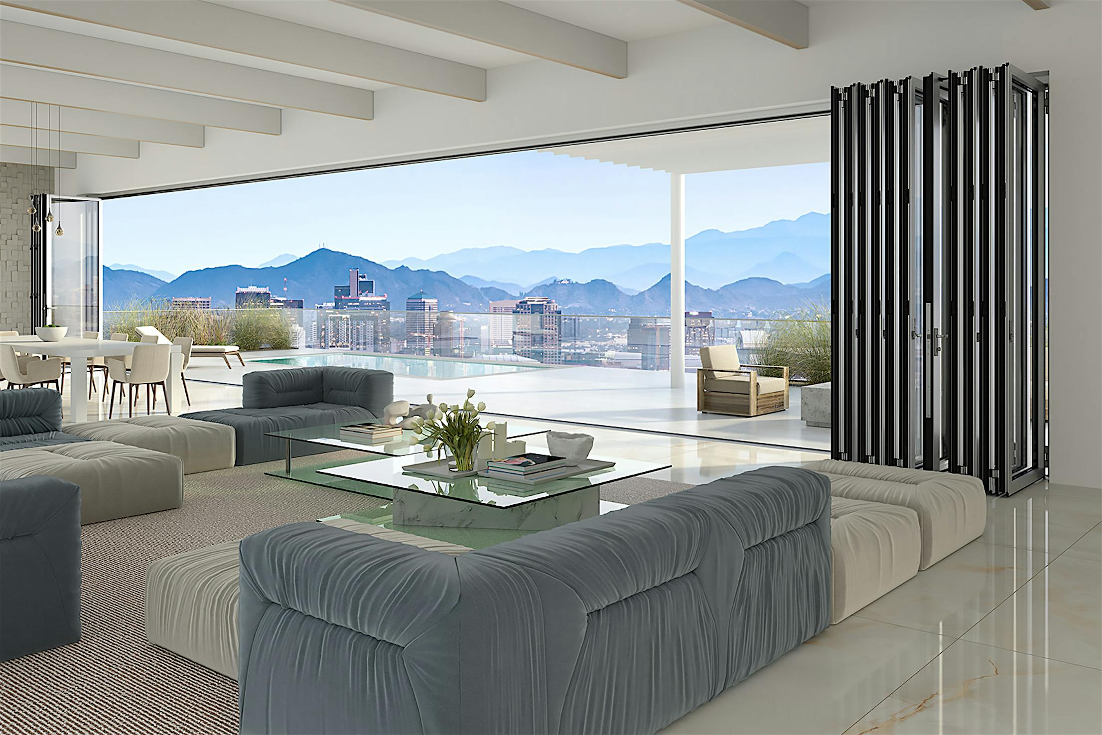 For openings onto balconies, terraces, and rooftops, this reinforced accordion glass door opens wide to 90% or more and is not restricted as with a traditional slider.