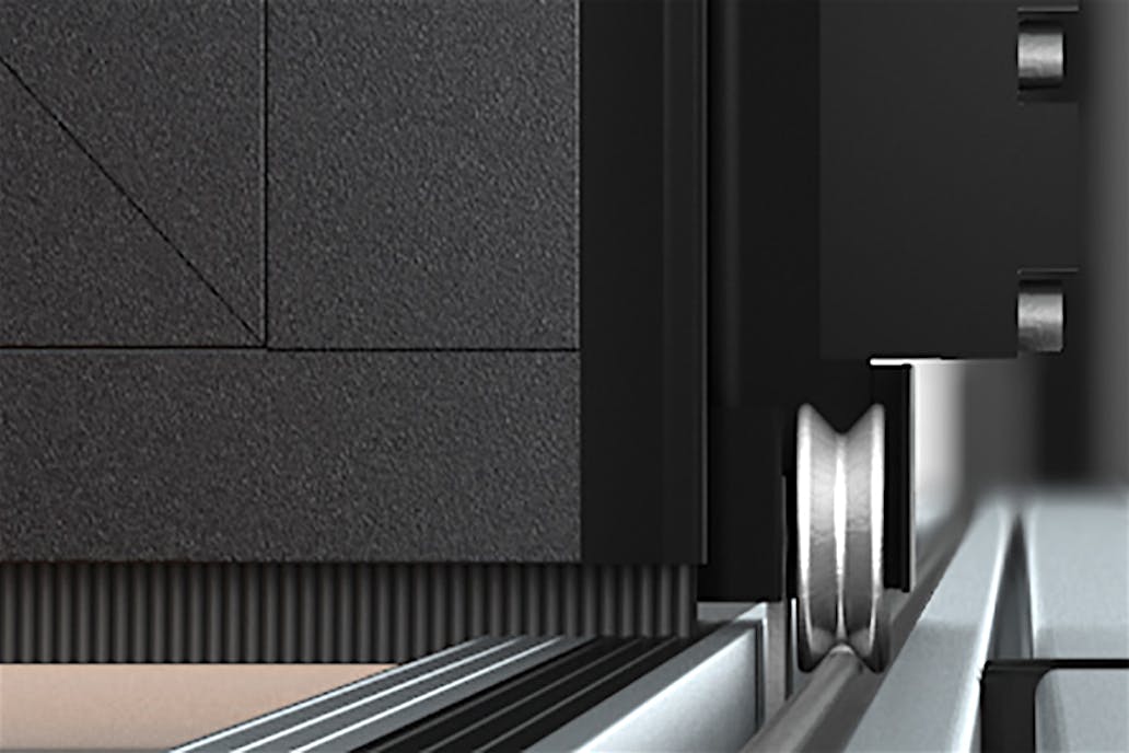 The running carriage rolls above the water table on two stainless steel wheels with a unique Gothic arch design supported by a double row of ball bearings. With a 2-point contact of each wheel to the floor track, the system glides quietly and smoothly with less friction by providing an equal distribution of weight on the stainless steel track.
