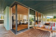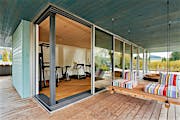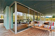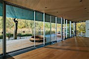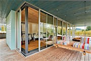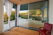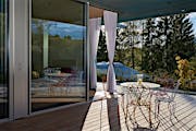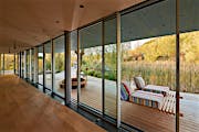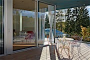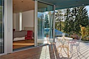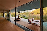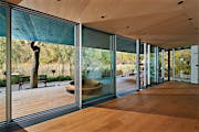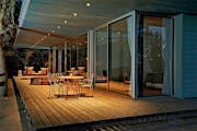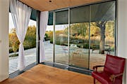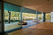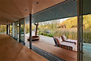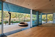 Multiple units of NanaWall SL60 were selected for the project because of its minimal sightlines and its ability to thrive in a tough Northeast climate. Folding door connect the mountain terrain with the inside of the home, even when the doors are closed.