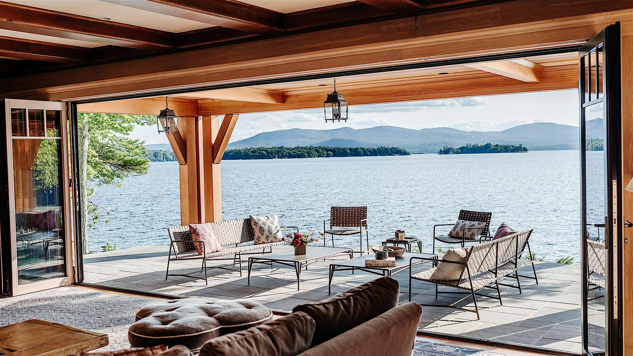 Immediately after building a guest house with a NanaWall system, homeowners from Wolfeboro, NH knew they wanted to add this design feature to their main house, a century-old house overlooking Lake Winnipesaukee. The goal was to have the lake feel like an extension of their home, where guests would want to come and stay for a while. Because the main house is so close to the waterfront, the porch views make it feel like you're on top of the lake.