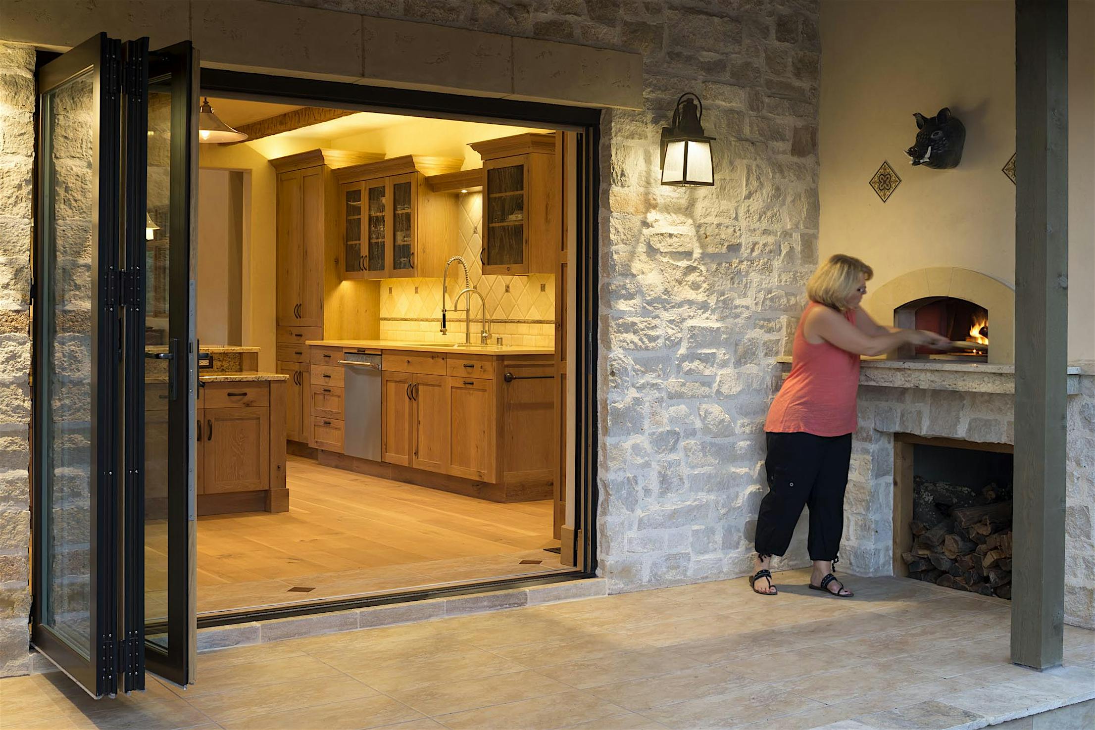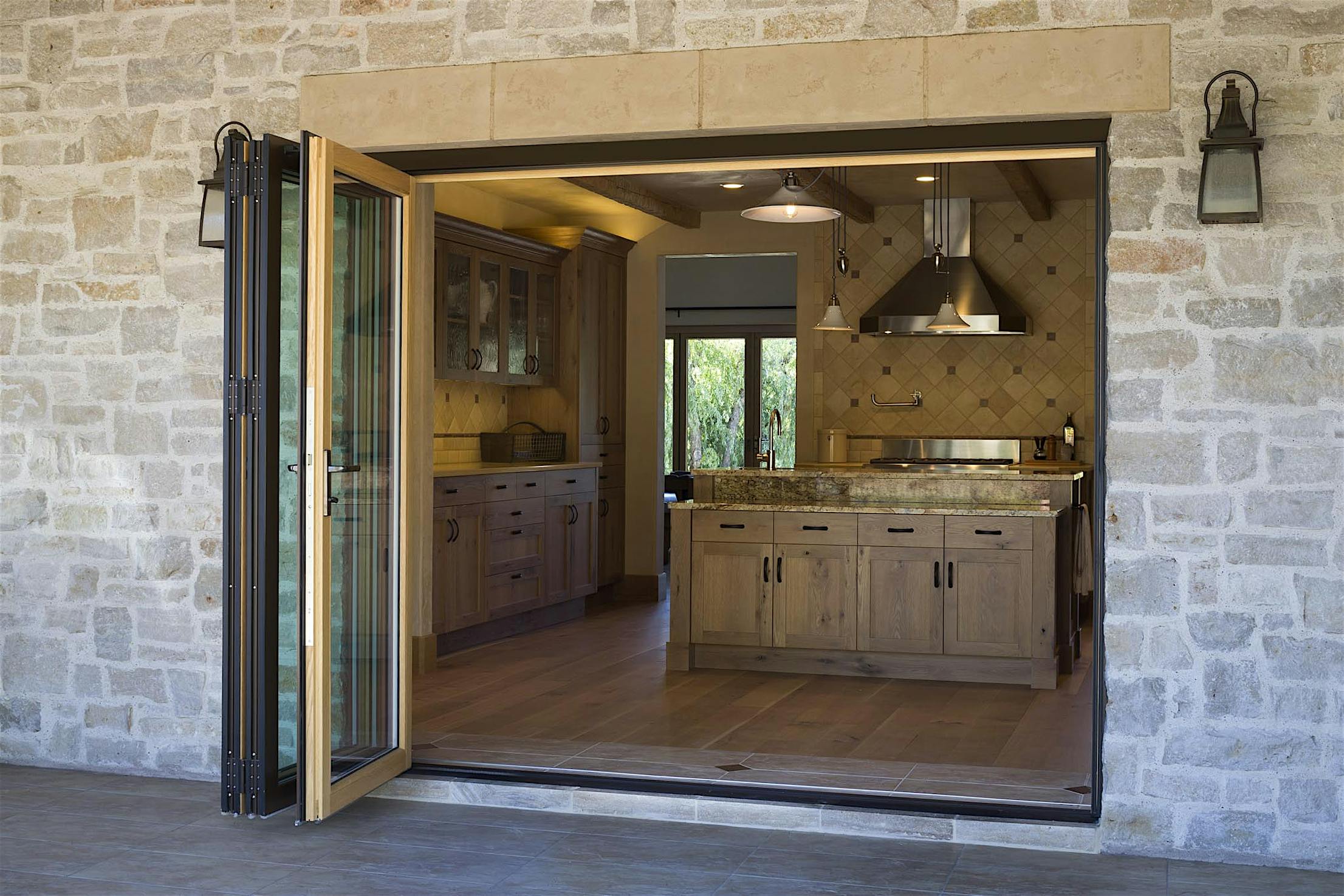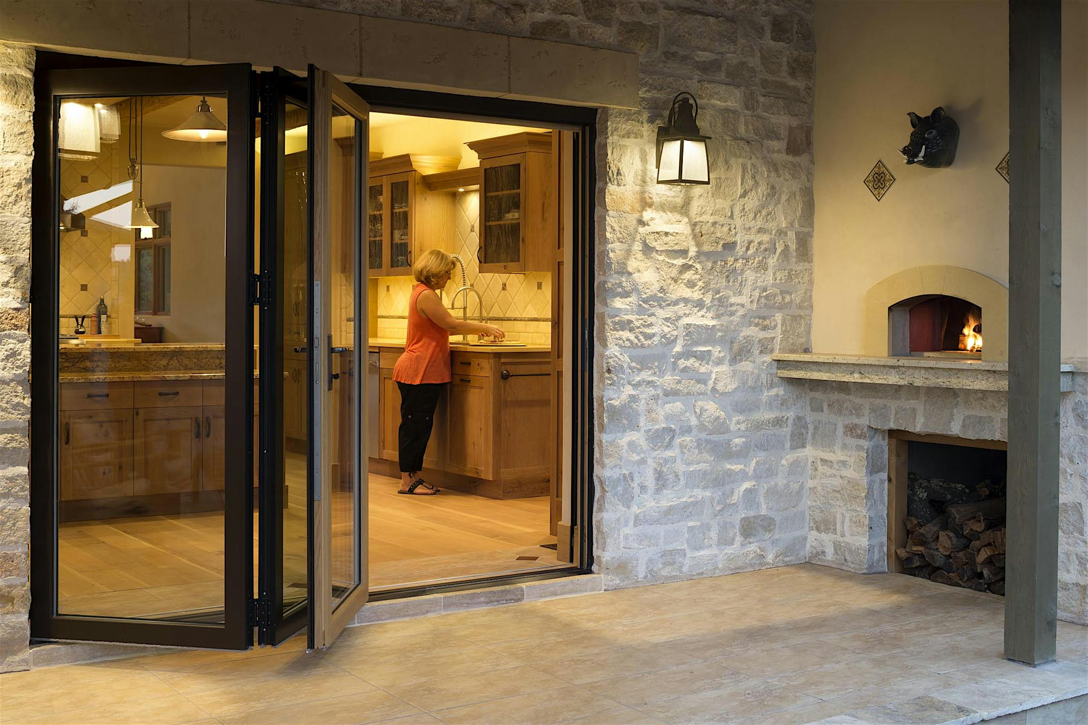 Each panel of the glass wall system is connected together along a single track and folds unto itself to create wide, unobstructed openings.