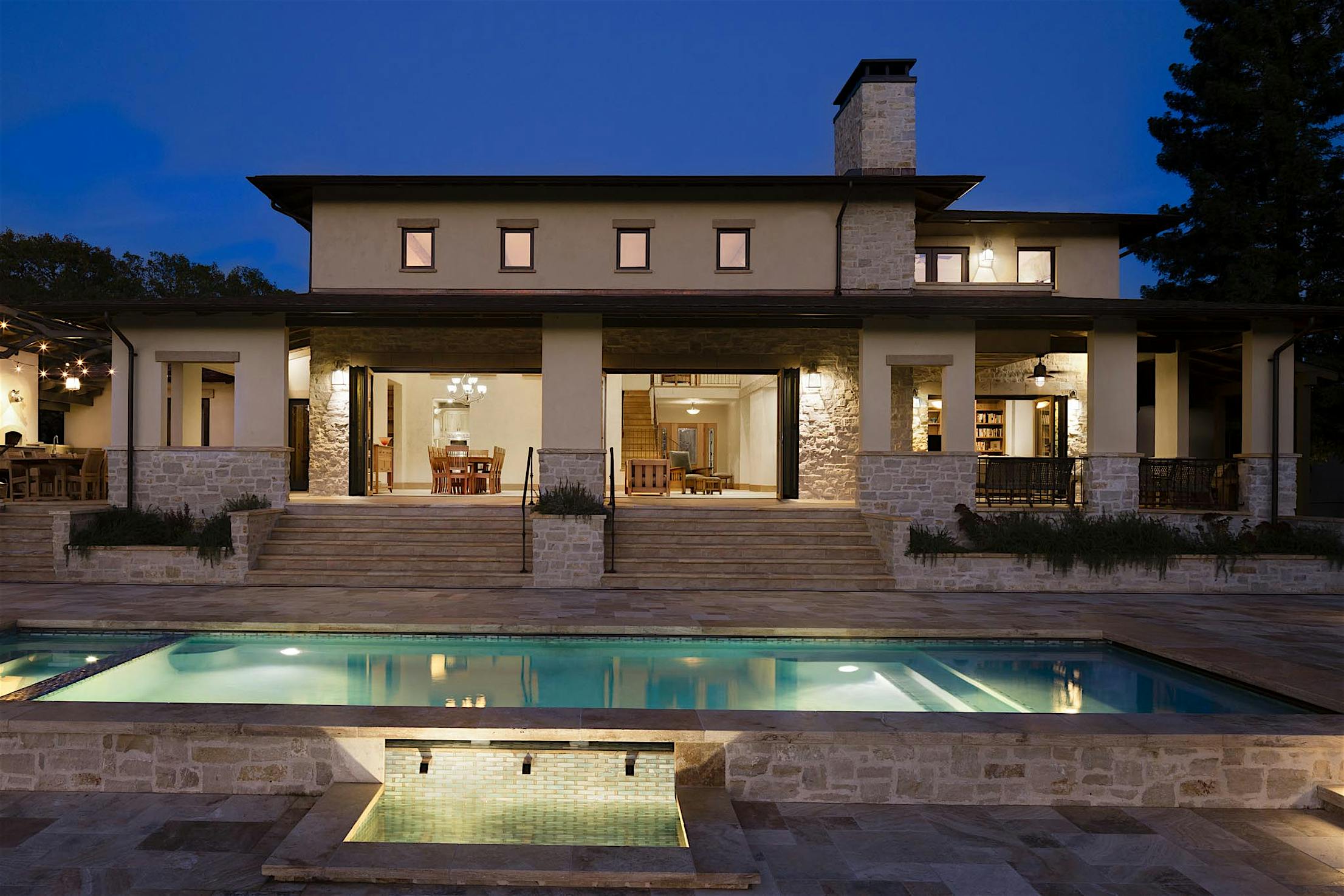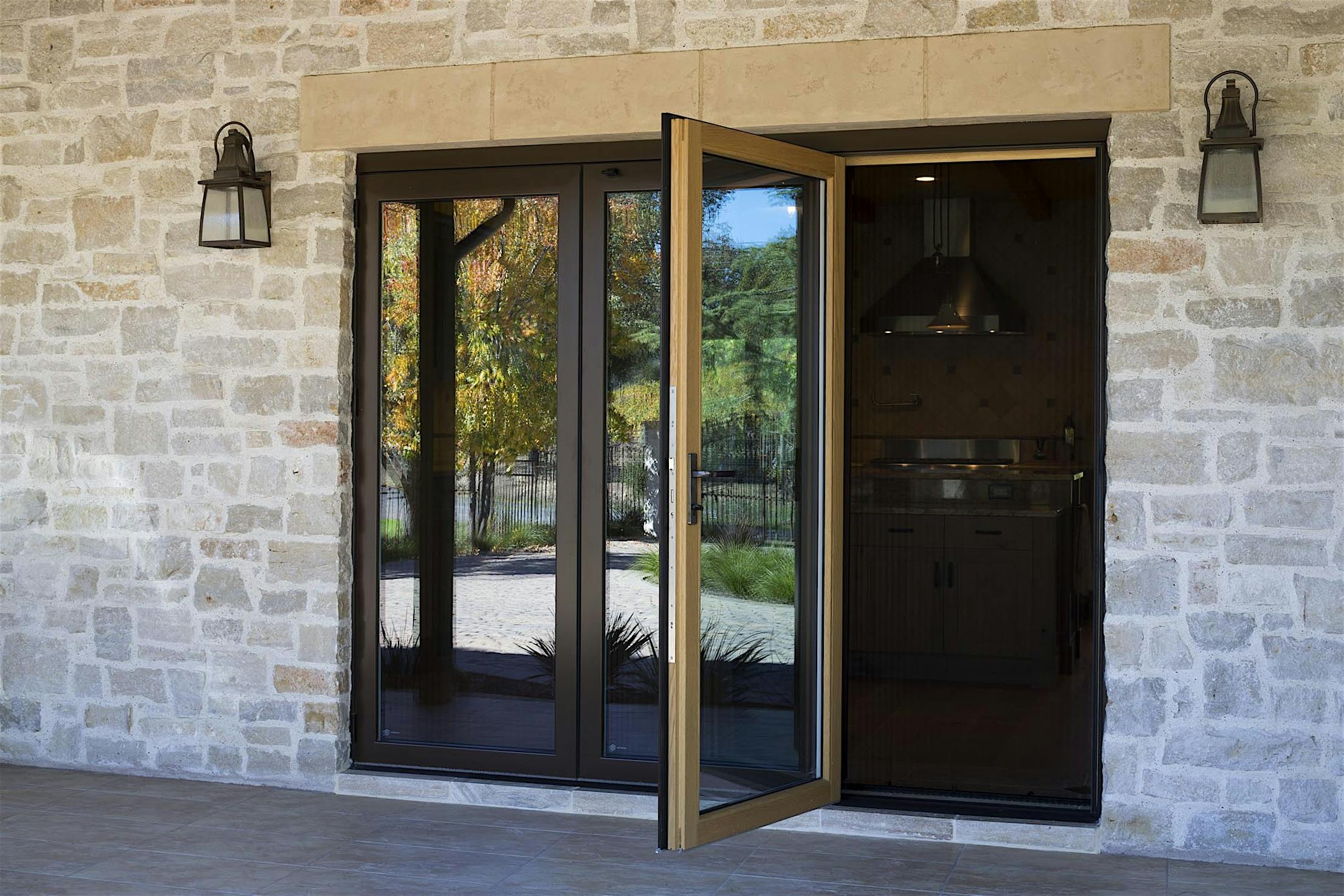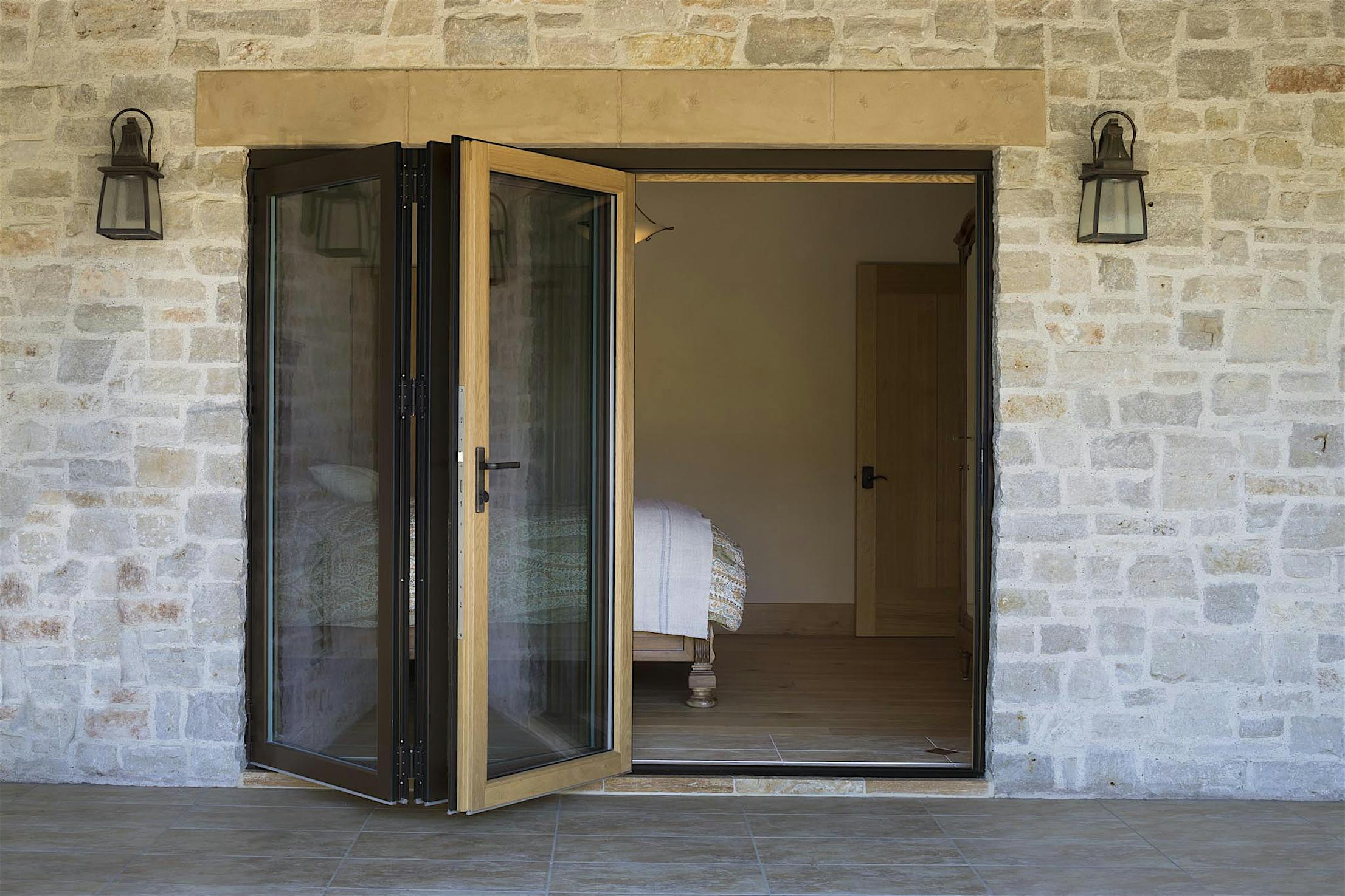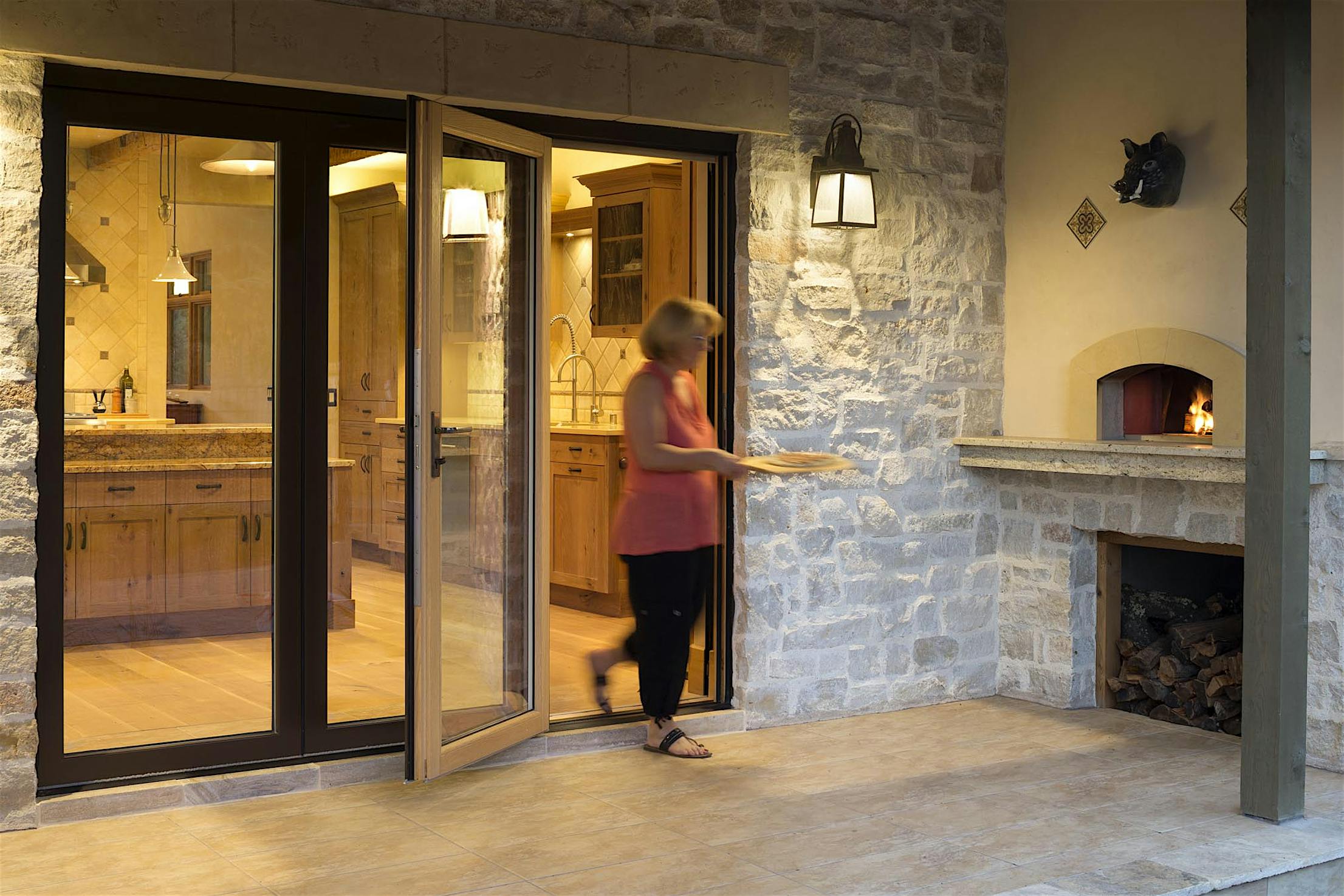 Each panel of the glass wall system is connected together along a single track and folds unto itself to create wide, unobstructed openings.
