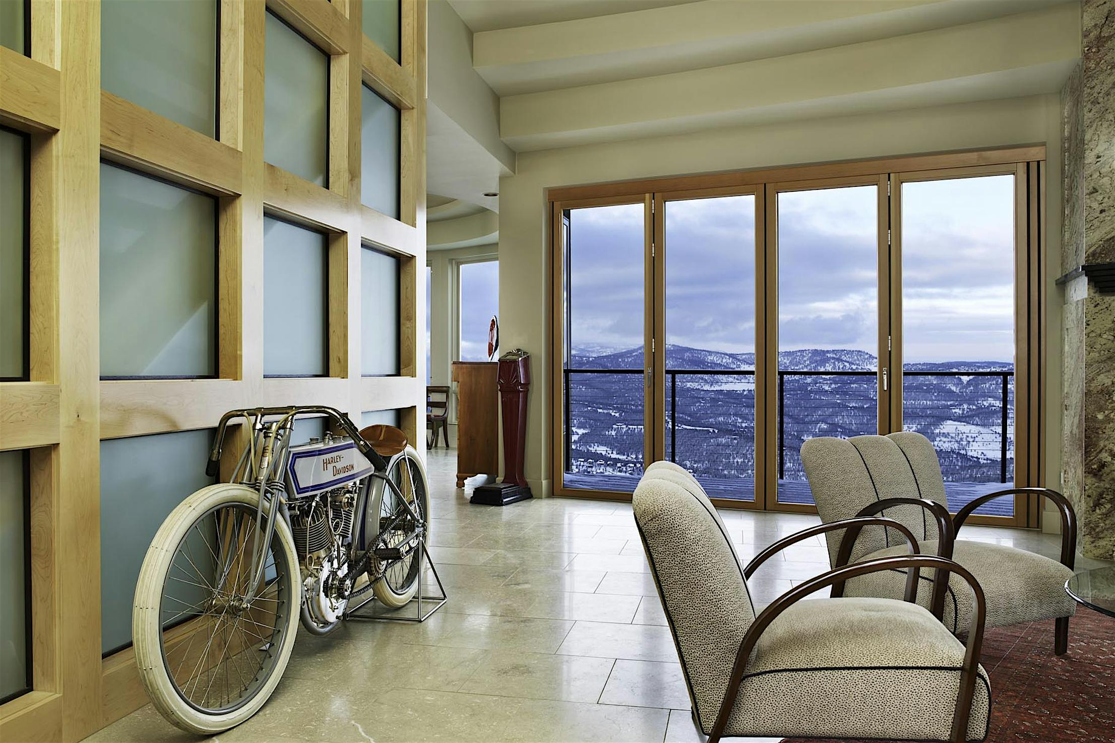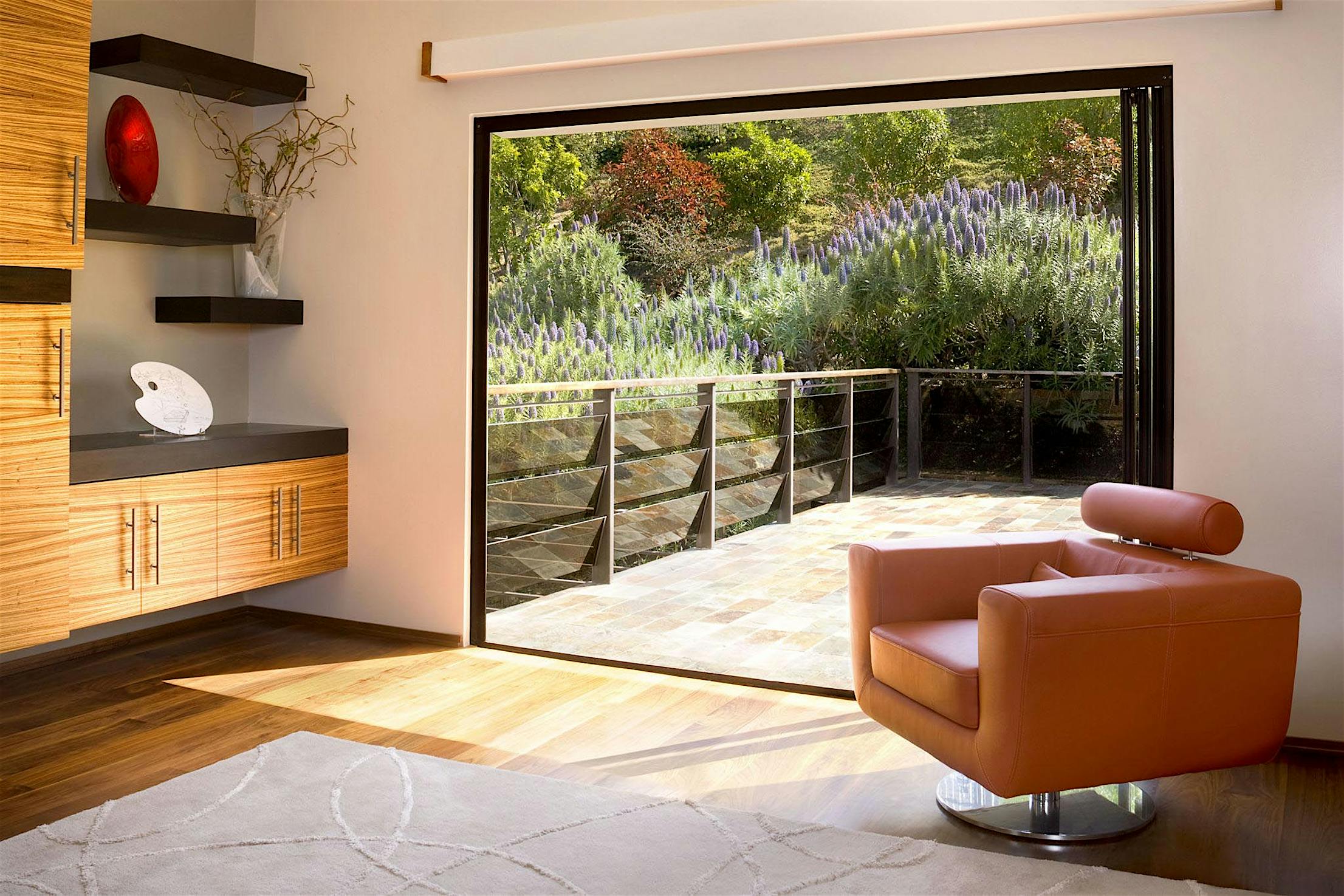 Each panel of the glass wall system is connected together along a single track and folds unto itself to create wide, unobstructed openings.