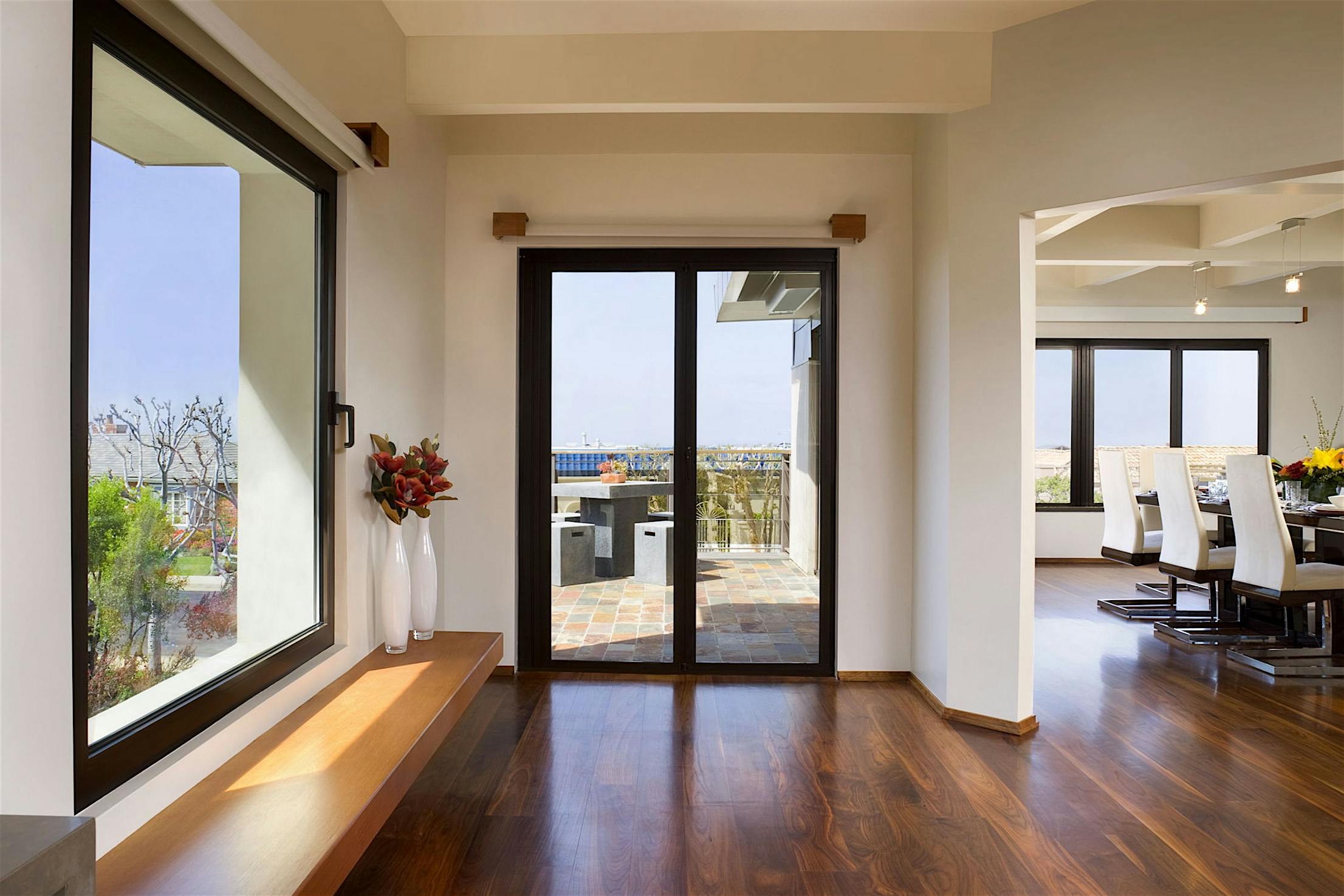 Traditional multi-track sliders only allow you to use one half of the opening. With a NanaWall opening, even with a smaller 3 panel system, the sense of usable space is expanded and the barrier is removed.