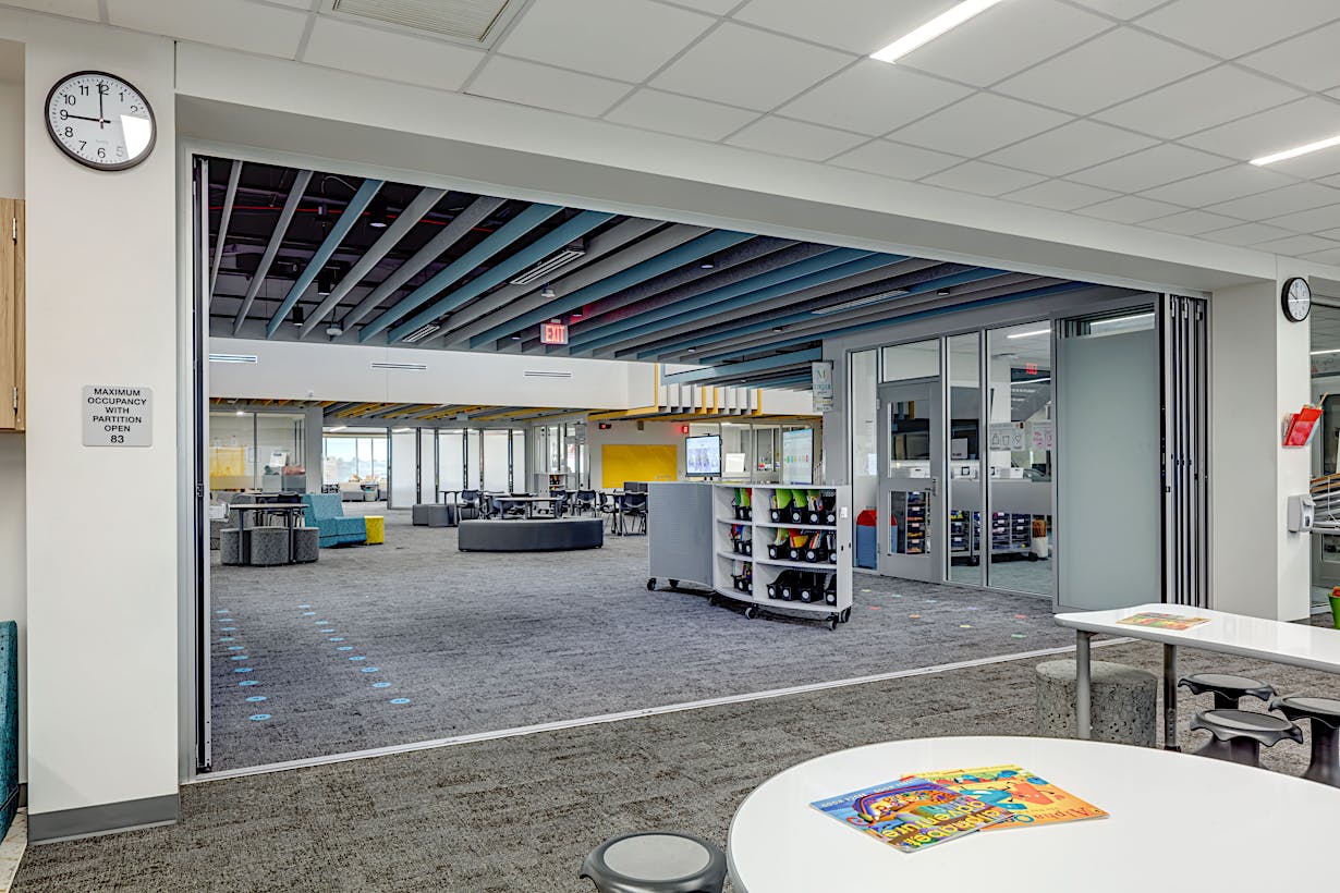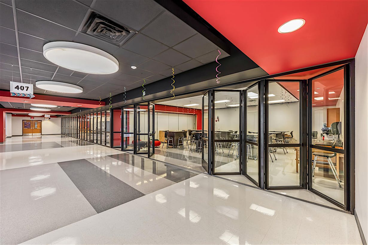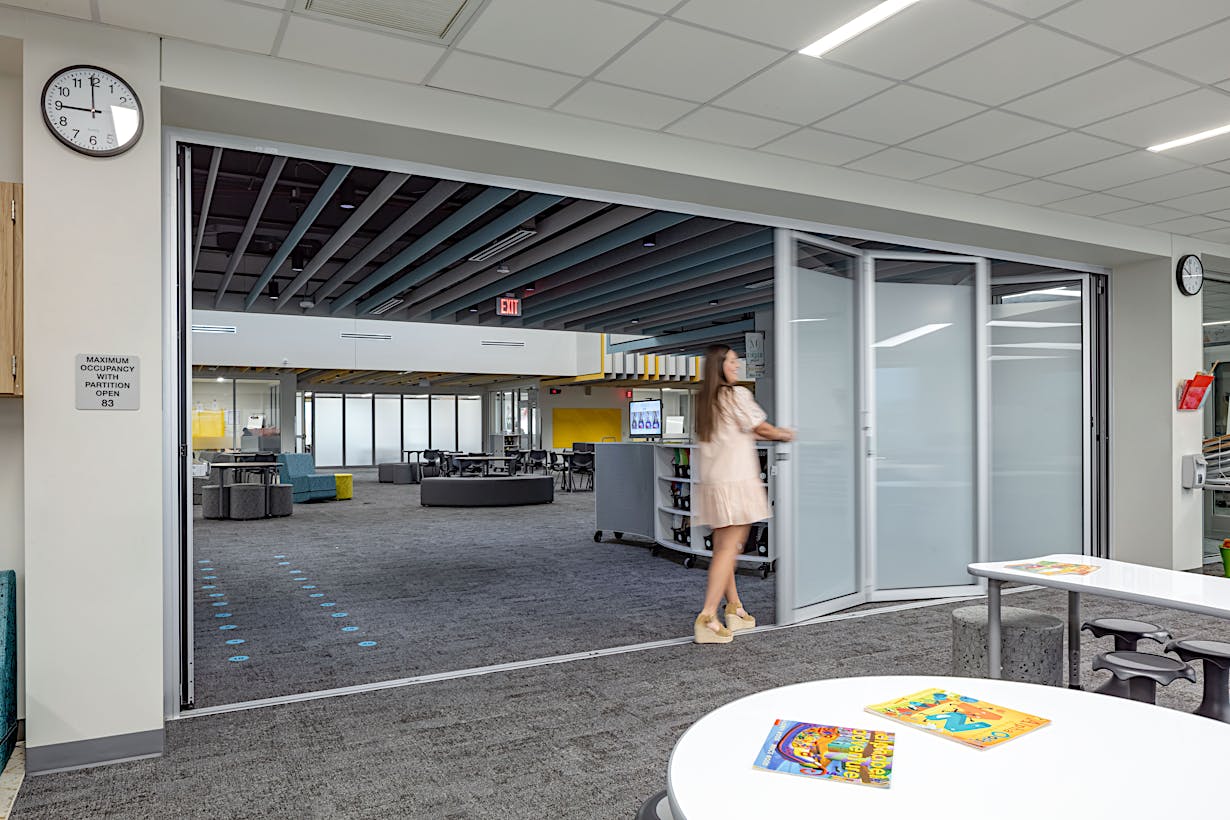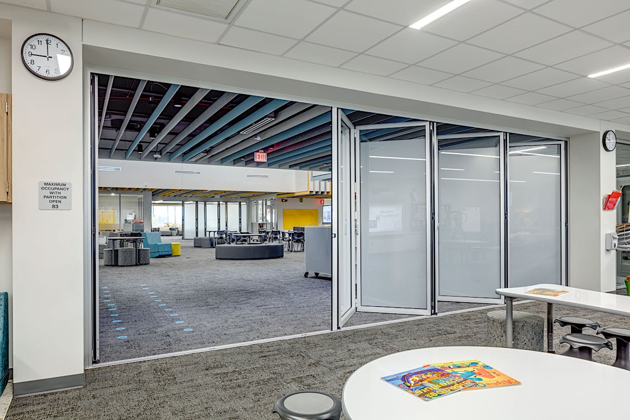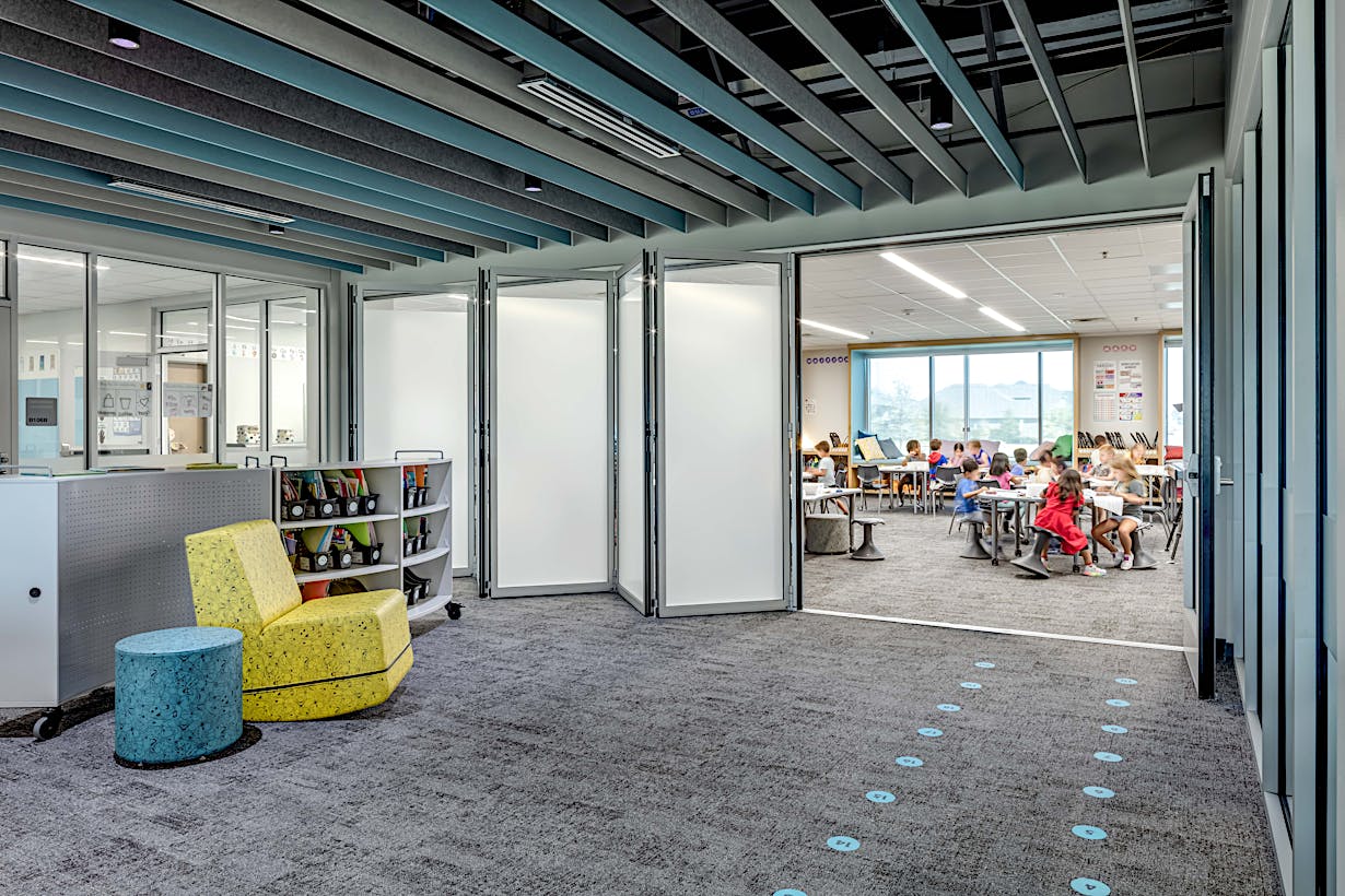 Seamlessly integrated opening glass wall dividers give teachers the ability to extend their classrooms into collaborative learning spaces where students can explore their curiosity.