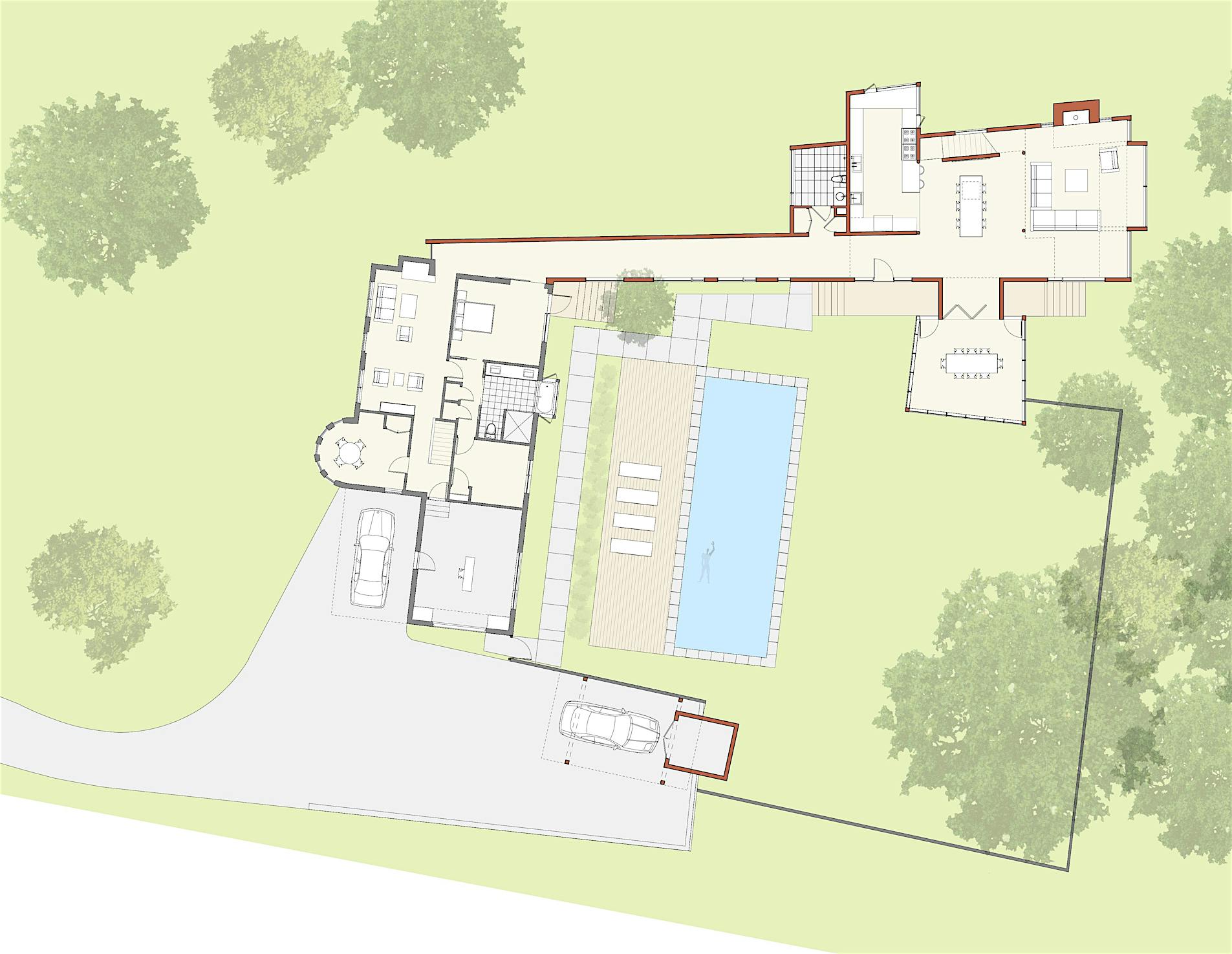 Barbara Johnson, an artist, and Ruth Gresser, chef, contacted McInturff Architects with a special request for their new property—the need for a courtyard house. Instead of demolishing the existing home and starting fresh, Mark and Peter suggested keeping the existing house and making it one of many structures that would surround the added courtyard that encompasses a pool and garden.