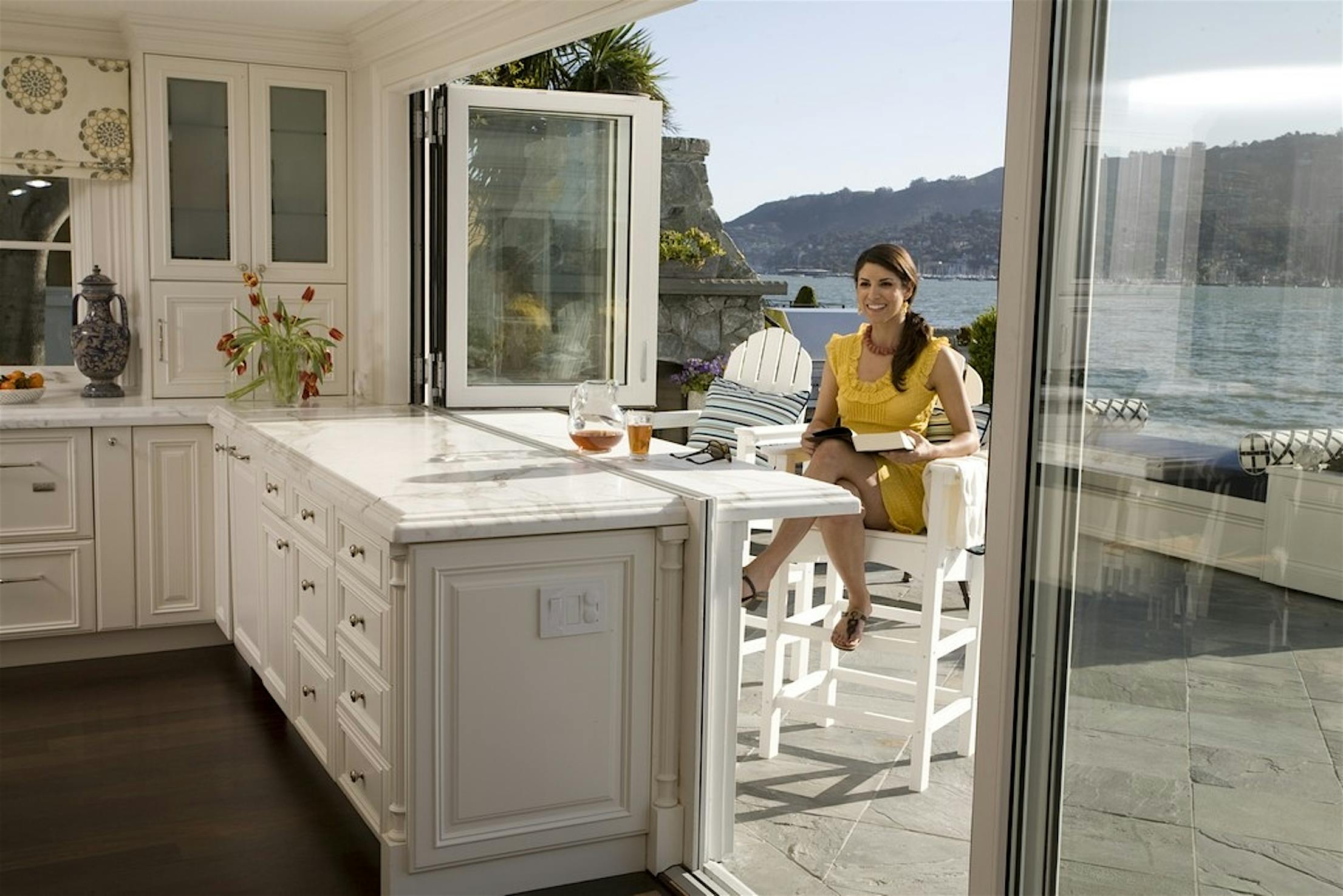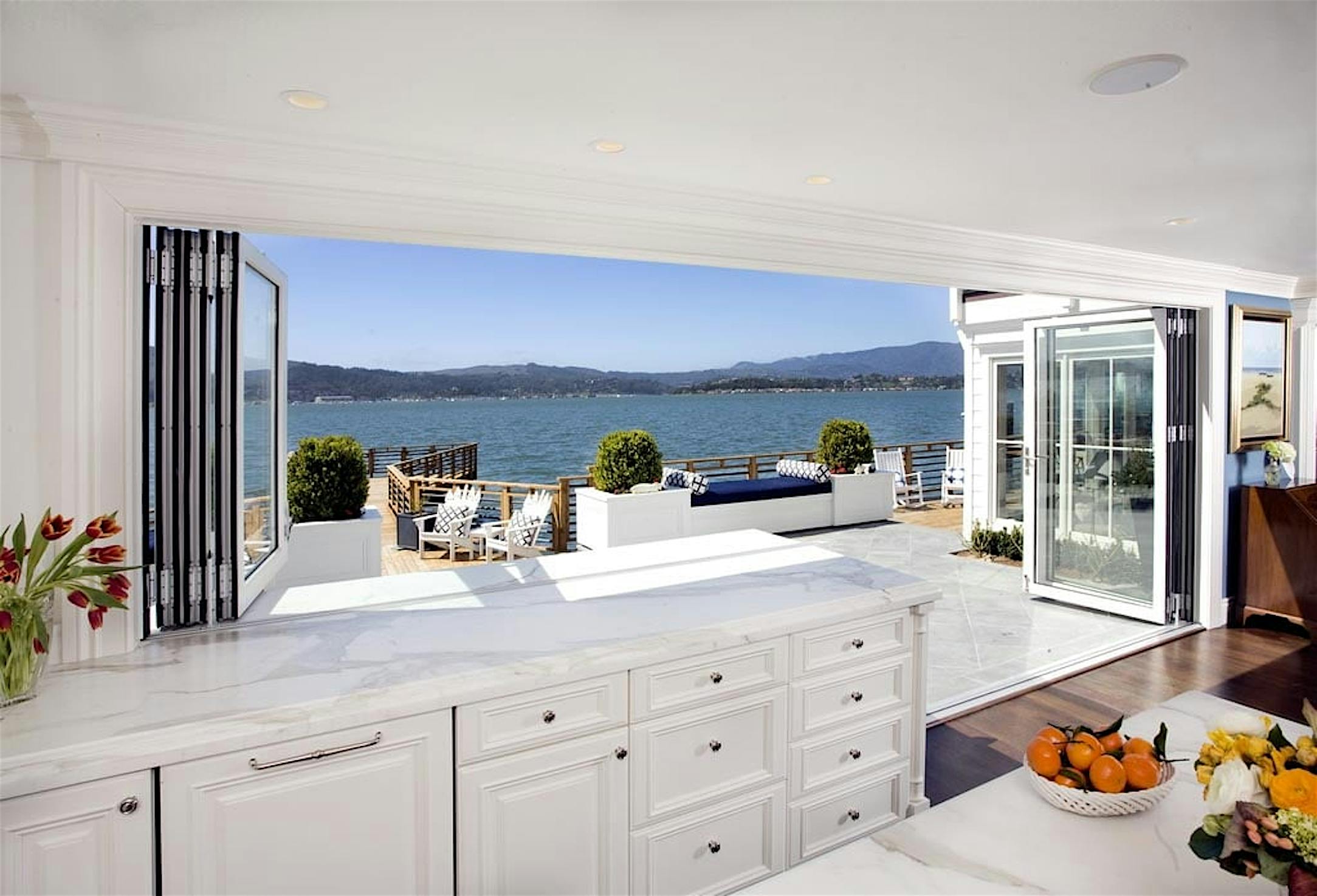 This Belvedere, CA kitchen opens up to a deck where guests can enjoy the beautiful views with easy access to snacks that can be placed on the counter-top.