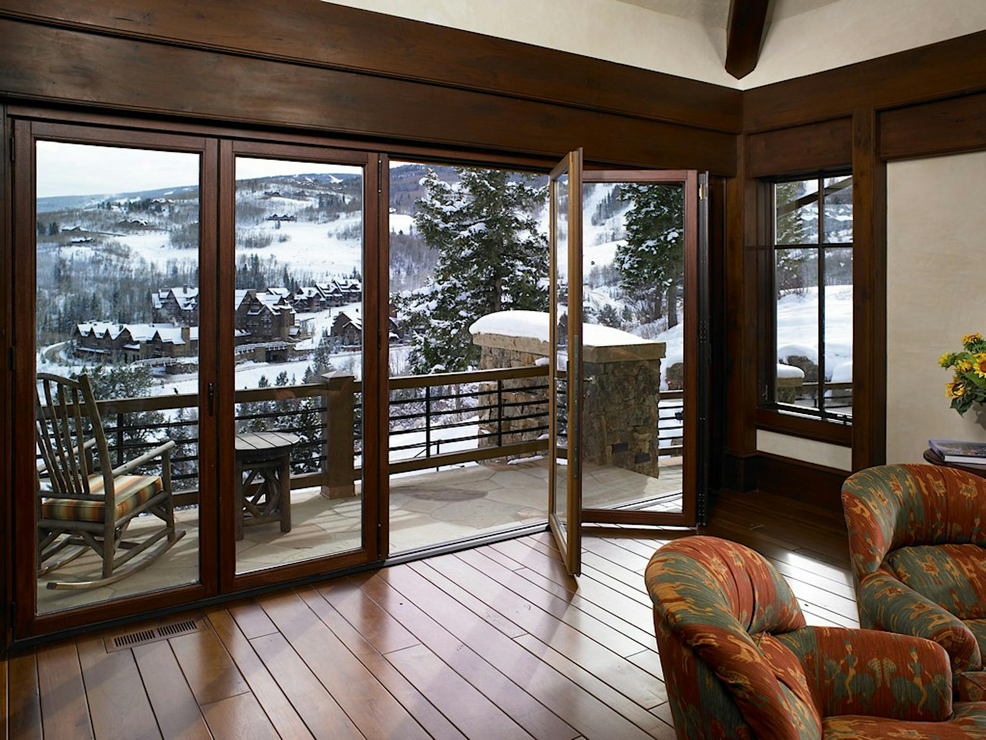 This rocky mountain respite enjoys views of its stunning surroundings all year-long with a little help from a WD66 opening glass wall.