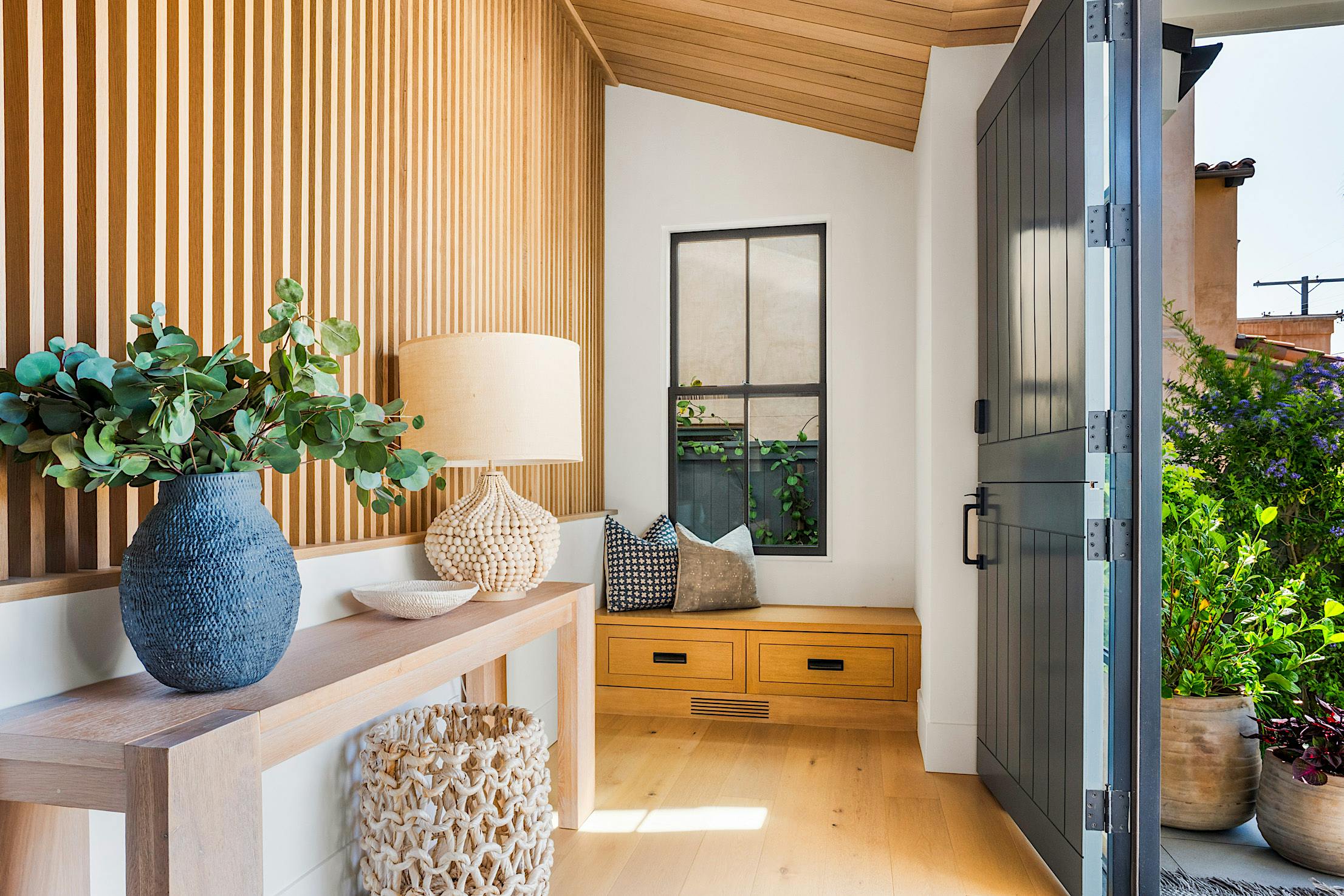 Upon entry, a bold, blue-gray-colored Dutch door welcomes guests into a bright and airy foyer. Here, contemporary wood slats filter light and offer a sneak peek into the interiors. Just behind the stylish divider, the open-concept floor plan is revealed. Multiple interconnected living spaces create a cohesive floor plan anchored by various color blocks and textures, carefully selected to reflect the family’s personal lifestyle.
