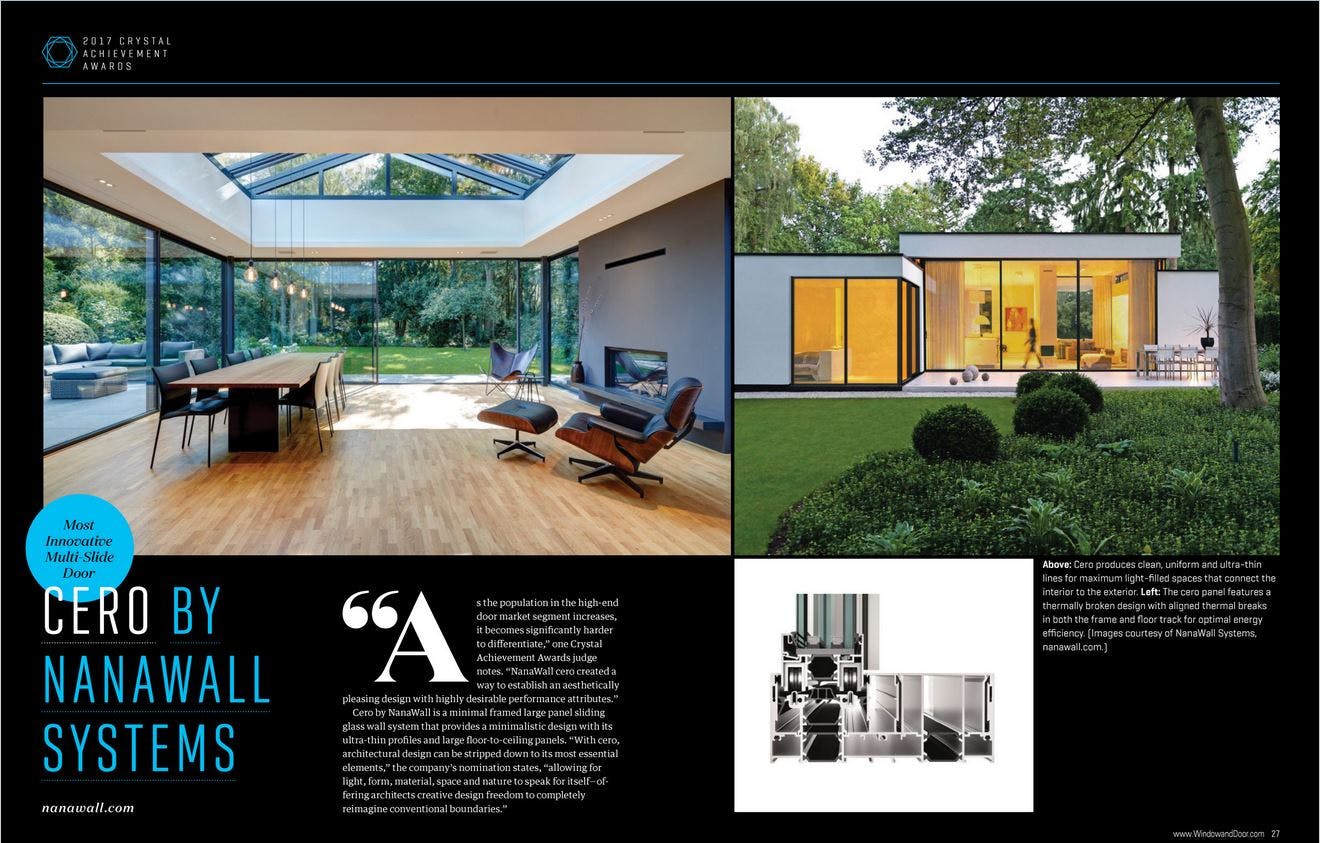 We are excited to announce that Window & Door Magazine has just named our cero by NanaWall product as the winner of their 2017 Crystal Achievement Award for Most Innovative Multi-Panel Door.