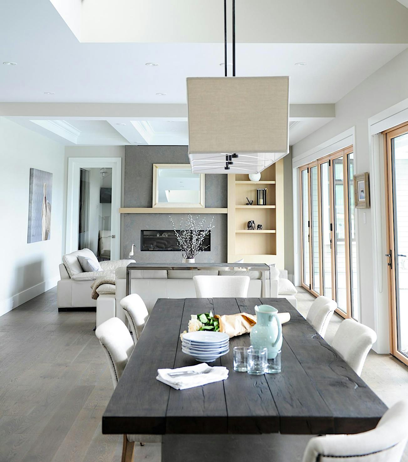 This inviting British Columbia home boasts an open concept floor plan softened by natural accents. Earthy tones envelop the walls and furniture while wooden accents enhance the farmhouse appeal—from the dining table to the NanaWall WA67 folding glass wallfeaturing the warmth and beauty of wood with a durable powder coat on the exterior for less maintenance.