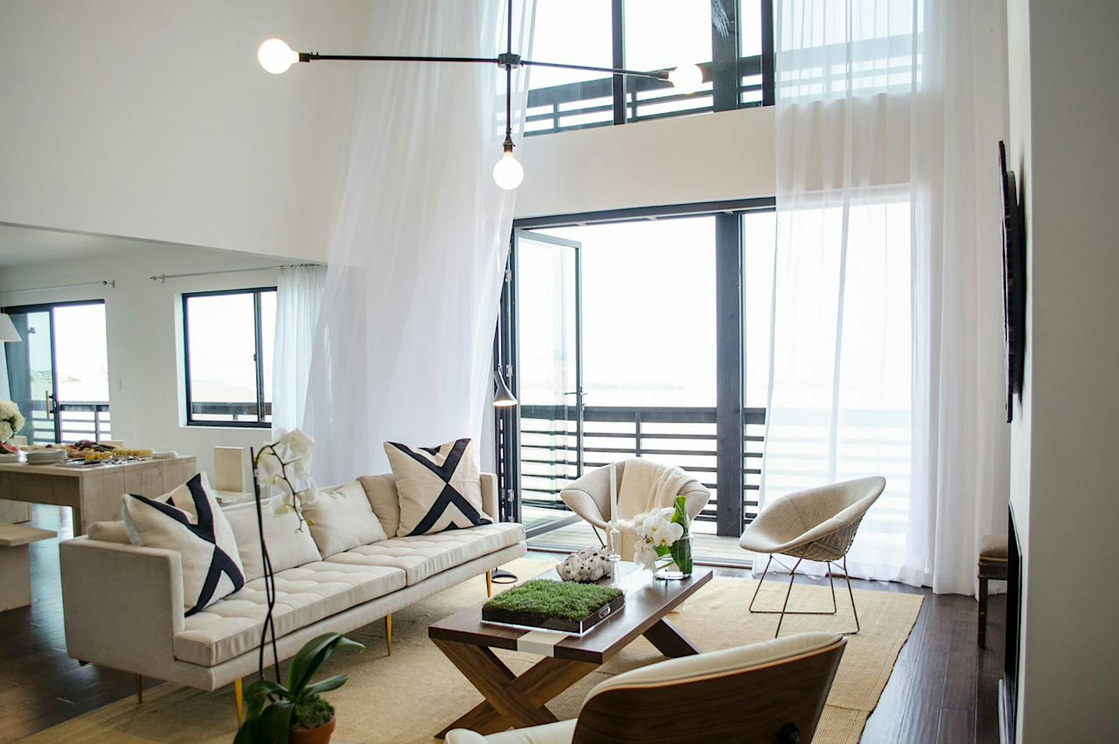 By replacing the old sliders with our folding door system, now the homeowners can enjoy completely open, unobstructed ocean views. With a large opening that merges into the balcony, the homeowners benefit from additional space, fresh air ventilation, and aesthetically appealing, clean-lined glass panels. New furniture, hardwood floors and a creative DIY light fixture complete the winning look.
