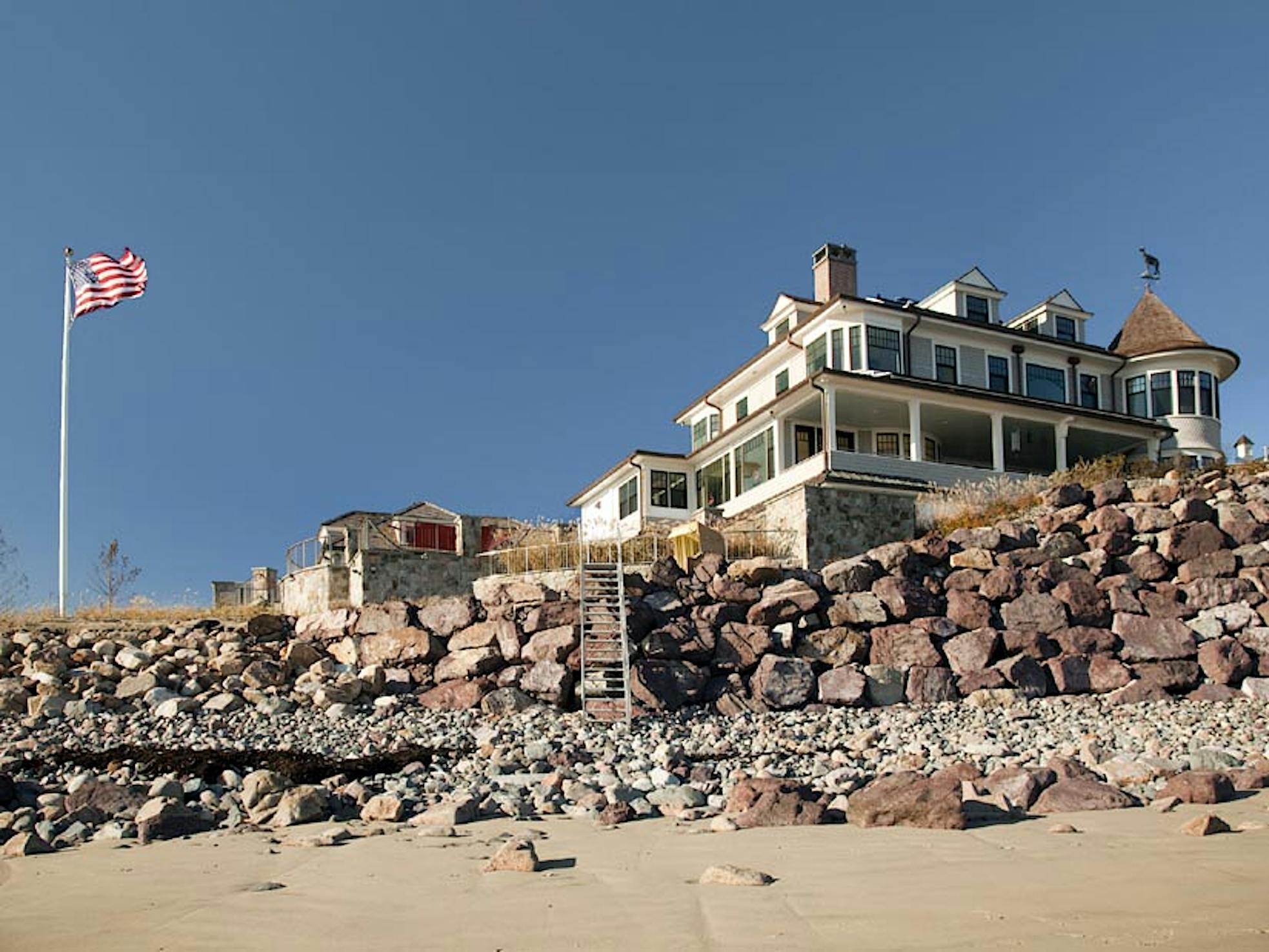 Having been neglected for nearly 50 years, this incredible dream home was rescued by new owners who sought to restore the home to its original grandeur by Siemasko + Verbridge, an architecture, interior and landscape design firm in Beverly, Massachusetts. Prominently located on the rocky shoreline, its presence welcomes all who enter into Marblehead from the Boston area. The exterior respects tradition; the interior combines tradition with a sparse respect for proportion, scale and unadorned beauty of space and light. The home had originally been built in 1899, taking four years to renovate; the historic facade was renewed and restored. The home was originally 4,000 square feet but was expanded to 9,300 square feet of living space, but was kept as historically accurate as possible. The existing sea wall was also rebuilt to protect the home and the neighboring properties. The interior were respectful of the past, yet in total harmony with its ingenious avant-garde improvements. The interior feels as cozy as a cottage with average sized rooms all minimally furnished by interior designer Jean Verbridge. The fully equipped kitchen was expanded by enclosing a section of the front porch and looks out to ocean views. Where the kitchen used to be located, now lays a two-story library retreat for the owner’s eclectic collection of art. A carriage house that was burned down was rebuilt with an attached garage that extends into an extra floor of living space, with a home theater, game room, sauna, and elevator. The high tech home has fully automated and energy-efficient systems; window blinds, espresso maker, landscape irrigation, solar roof panels, and the temperature of the wine cellar, pool water and sauna can all be controlled remotely. If the owners are away and a storm blows in, the push of a button will drop shutters into place over windows. To see more on the building and restoration of this incredible home, check out the owner’s blog, here.