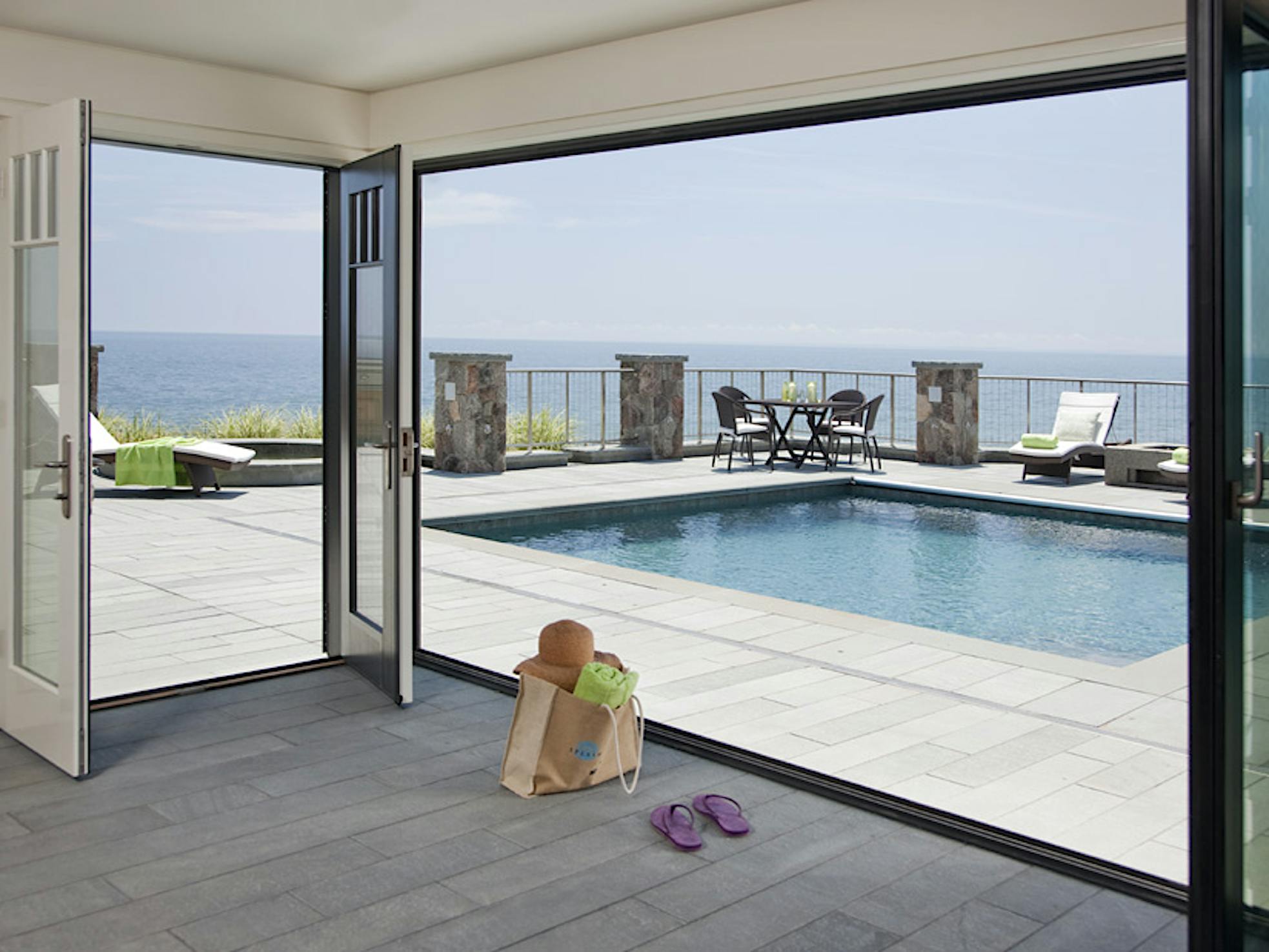 A NanaWall Systems door folds, accordion style, completely out of the way; the swimming pool can be fully opened to the lower level of the house where the is a second kitchen, changing rooms and full bath.