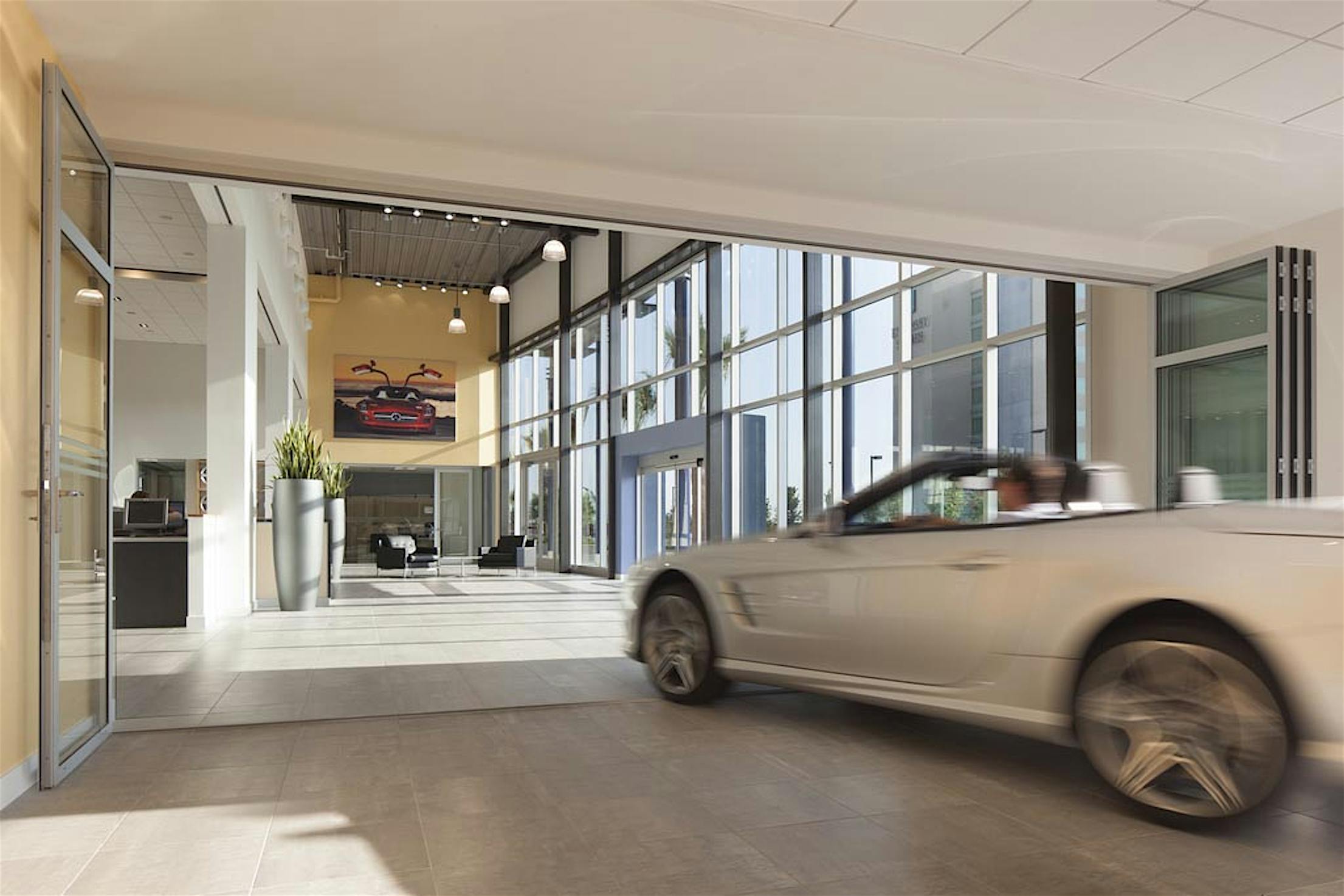 They used a NanaWall system for entry/exit. The large glass doors fold open about 20 feet wide, making it easy to transport small or large cars in and out of the showroom. Some other great aspects: the clear glass showcases the Mercedes Benz luxury vehicles, the floor track is flush with the ground and doesn’t get in the way, and the doors are secure when locked and closed.