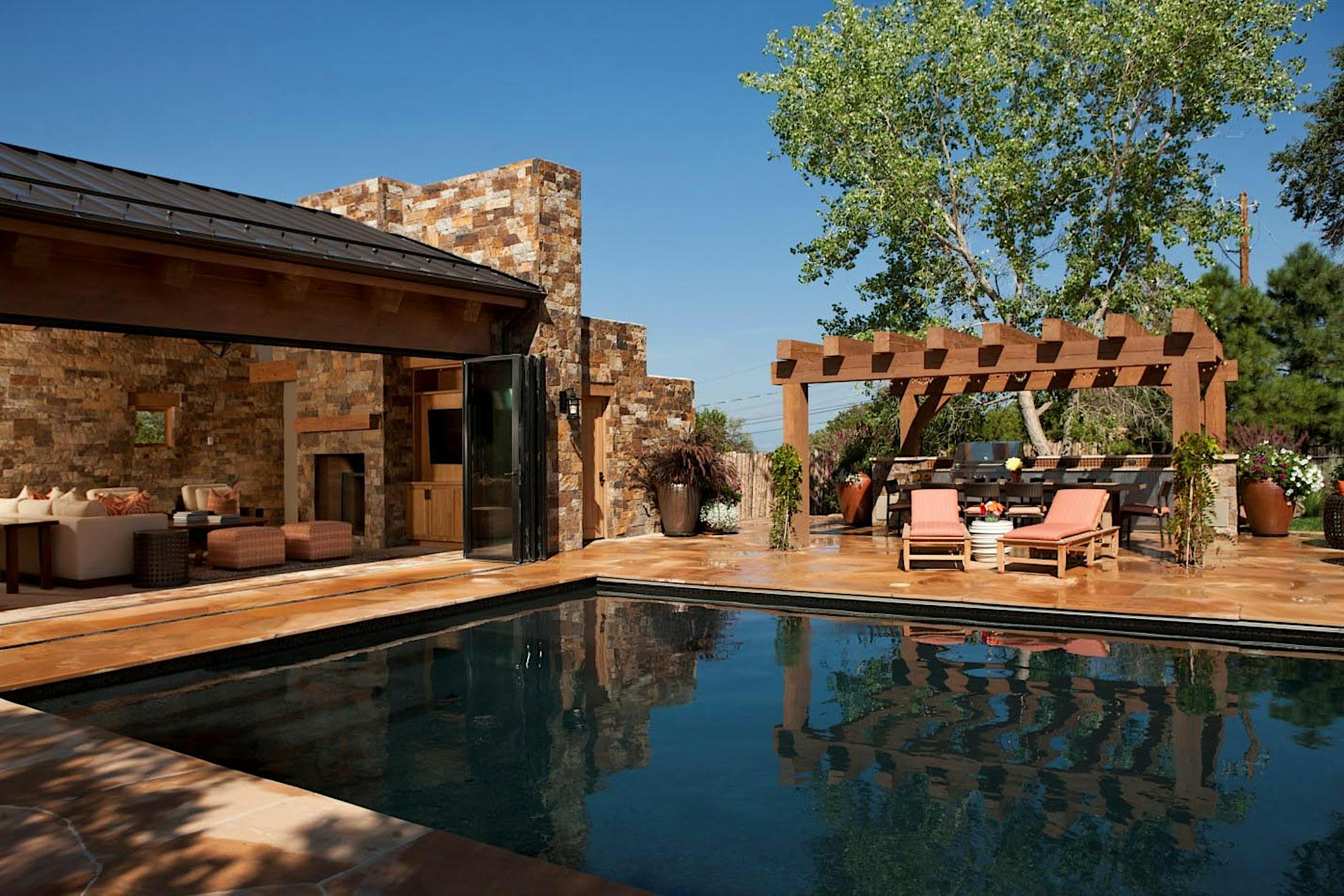 Architect Kinsey, who has worked on projects all around the west coast of California, says “This outdoor pool house is based on the architectural style that uses all natural materials, including stone, heavy timber and adobe.” Featured in SuCasa’s Southwestern Homes and Living magazine, Kinsey continues to say that “this project incorporates all of the natural and spiritual elements: fire (warmth), water (life), earth (stone), and wind (shelter).” After vacationing in numerous places and bringing in an inspiration from each location, the pool house symbolizes and represents Connor and Christina’s time spent traveling. With friends and family coming over three times a week, the family is always ready and prepared to entertain. The heavy wind and snow during the winter months didn’t stop the family from using their pool house; “the family has successfully celebrated Christmas in their pool house with a massive tree that only the NanaWall system could bring in”, says Kinsey. With heated tiles, a fire pit, and weather resistant doors, this pool house never takes a break and allows for a year-round indoor/outdoor vacation spot for the family.