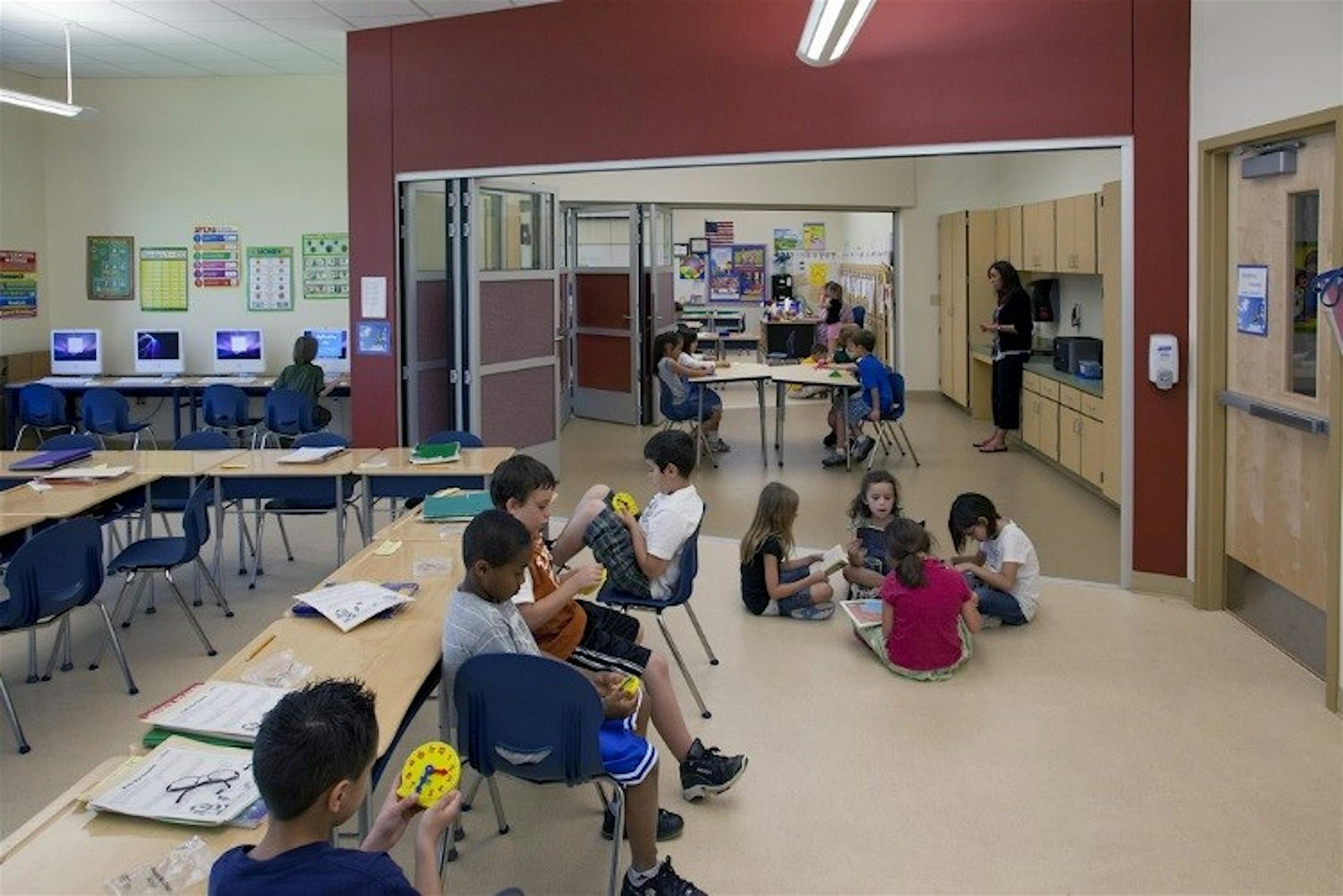 Burleson Elementary scholastic renovation in Dallas, Texas also underwent a remodel recently. At Burleson, the goal was to integrate a multipurpose room between two classrooms.