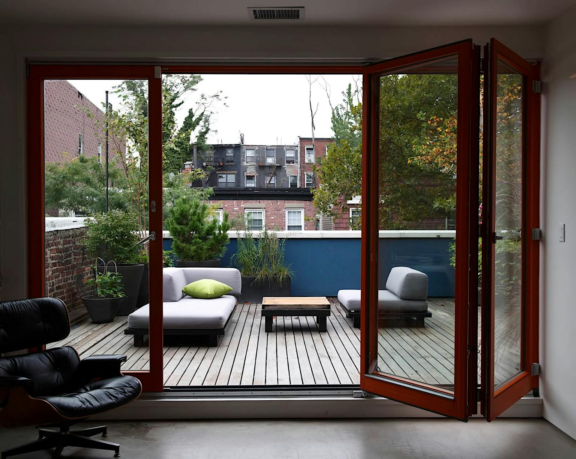 Glass and wood doors from Gaulhofer lead to a sweet roof deck off the guest room.