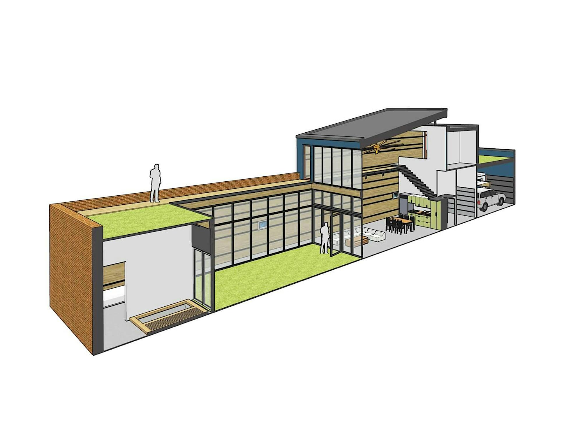 The client wanted to incorporate parking and a recording studio, which were placed at the street end of the building.
