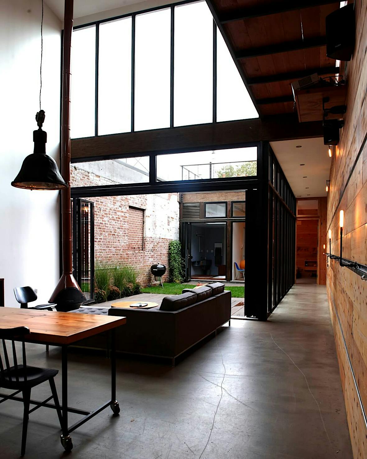 The homeowner salvaged the pendant lights above the dining table/kitchen island from an old theater.