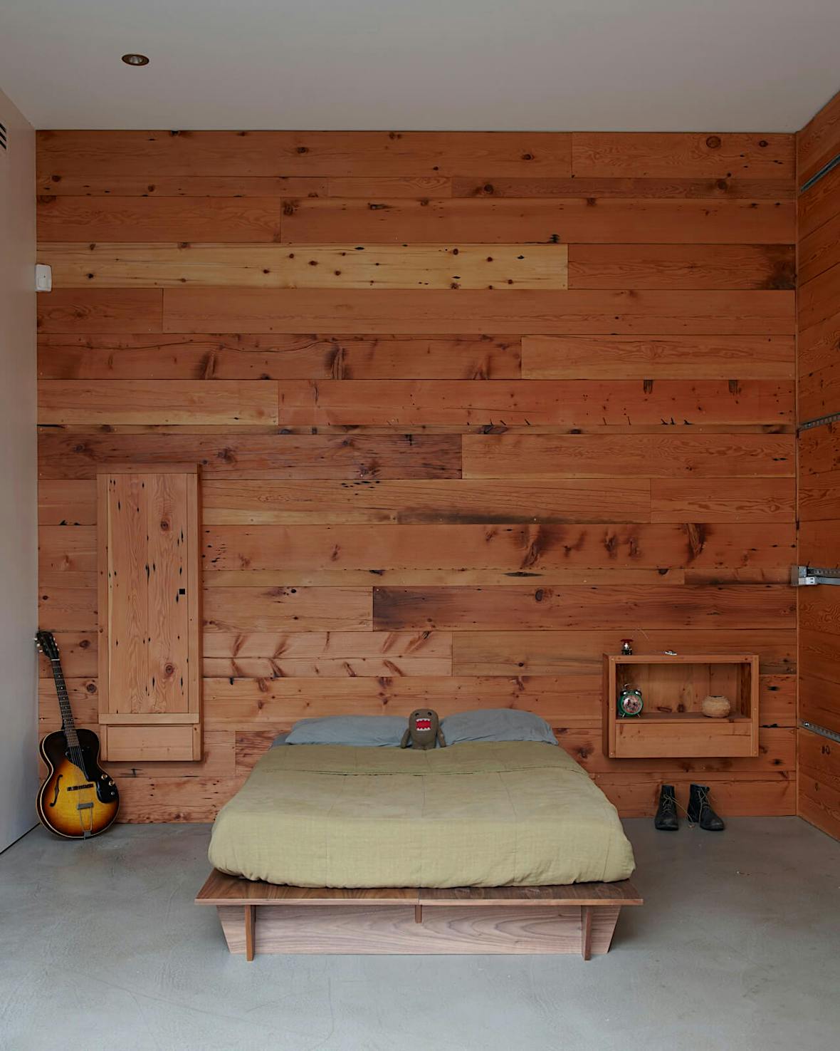 Wood interior walls were made of beams salvaged from the roof joists of the original structure, sliced into 3/4-inch siding. Tracks along the walls enable the owner to easily display or change artwork, lighting, electronics and projections.