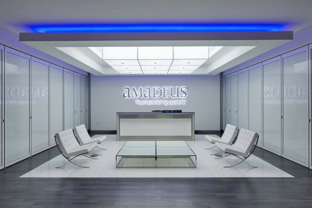 The FlexSpace layout in Amadeus’ reception area is shown in the floor plan above. Operable glass walls partition two smaller areas into board rooms when the panels are in the closed position, alternately, they can be opened and stacked out of sight to create one large shared space. The flexible floor plan provides either an open-concept layout or distinct private workspaces when desired.