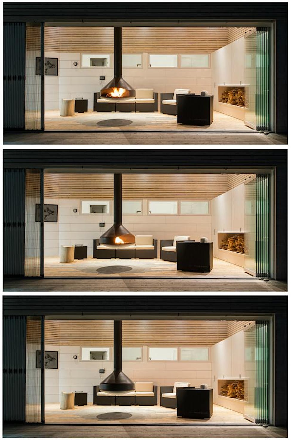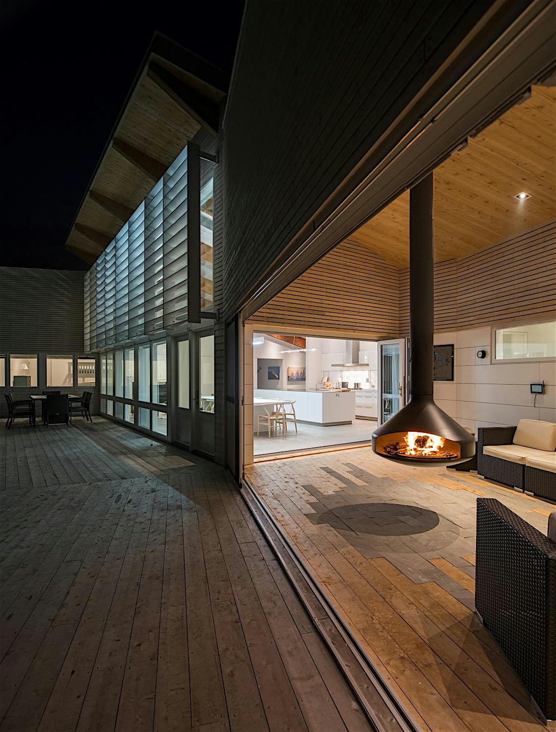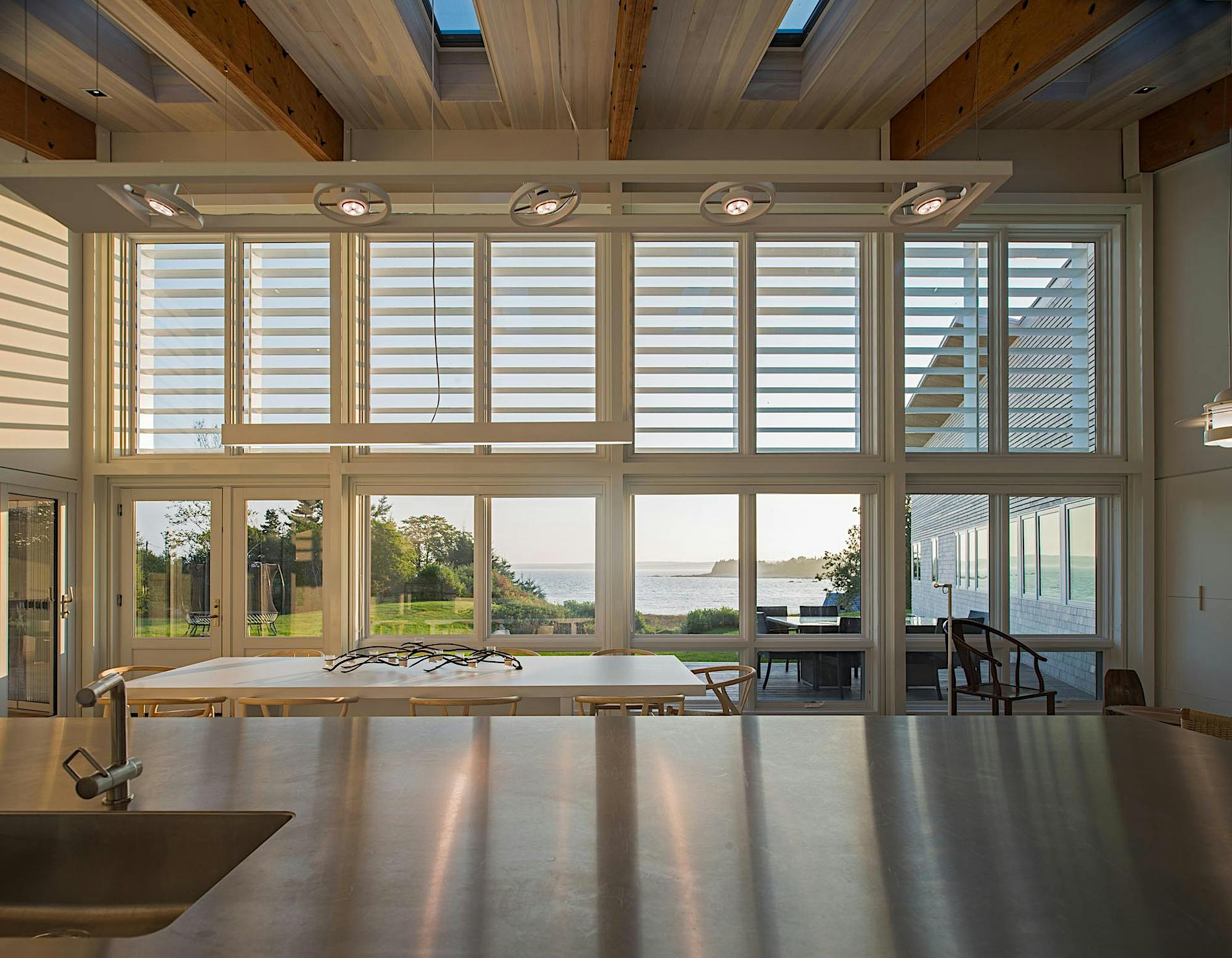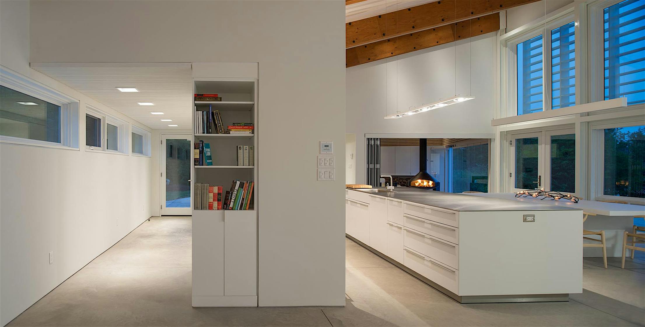 The great room includes a kitchen, dining and living room, which houses a 6 foot long gas fireplace. From the great room a fully collapsible glazing system (Nanawall) morphs an exterior screened porch into the primary interior social zone, creating an uninterrupted large summer space.
