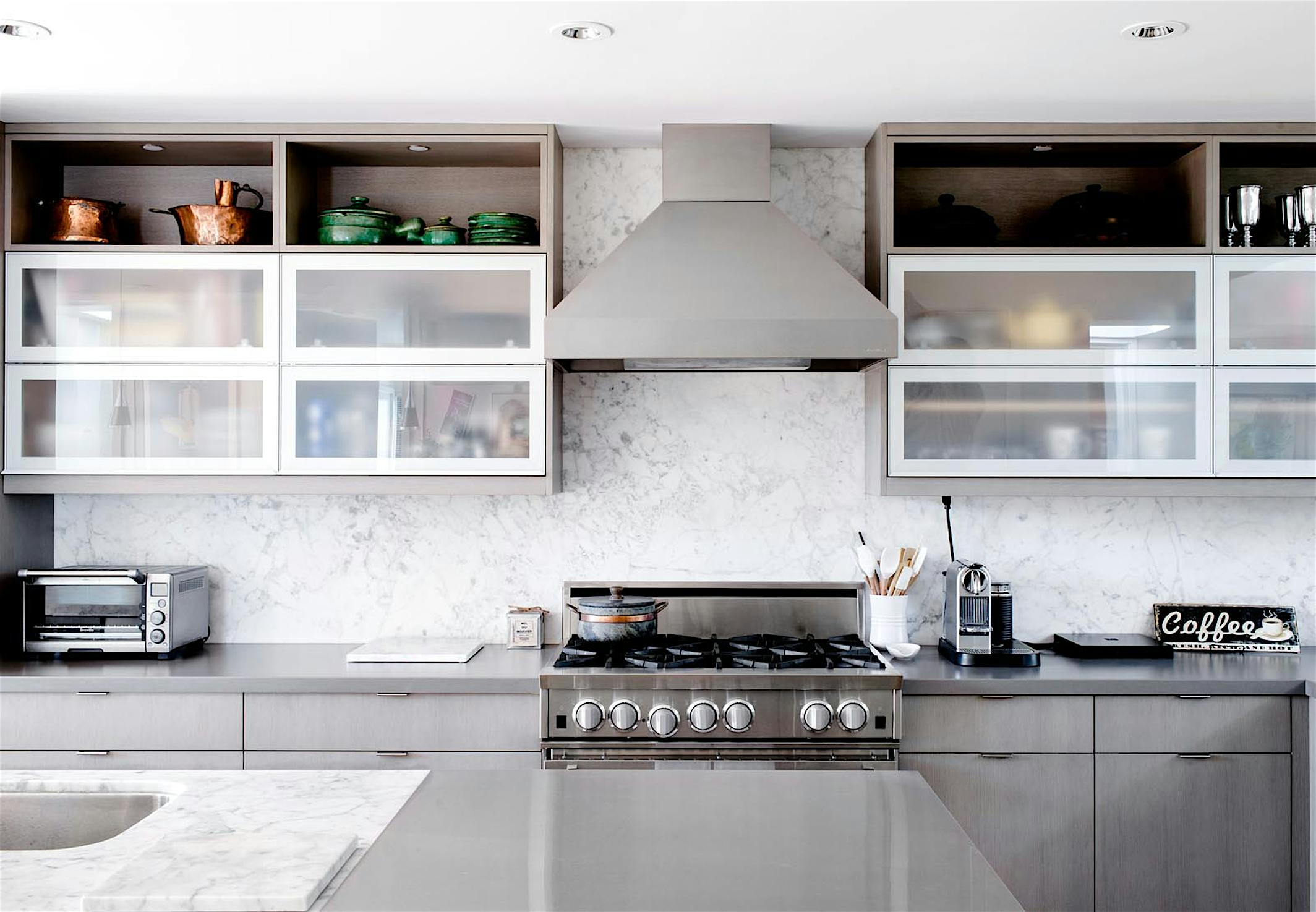 The search for a 13-foot-long island to fit their kitchen led them to marry Calacatta Miele and stainless steel to make one giant counter. Marble, they discovered, was available only in 10-foot slabs, due to the dimensions of shipping containers.