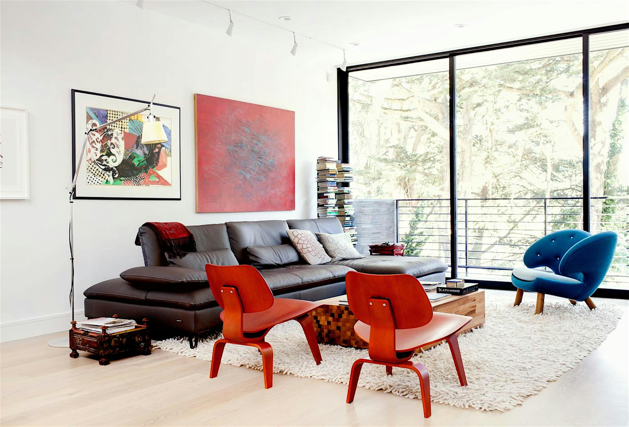 The main floor is arranged as one long, contiguous space, with a living area and balcony at the front end. An Aulia coffee table by Henk Vos, a pair of red Eames molded plywood chairs, and a Pelican chair by Finn Juhl center the space.