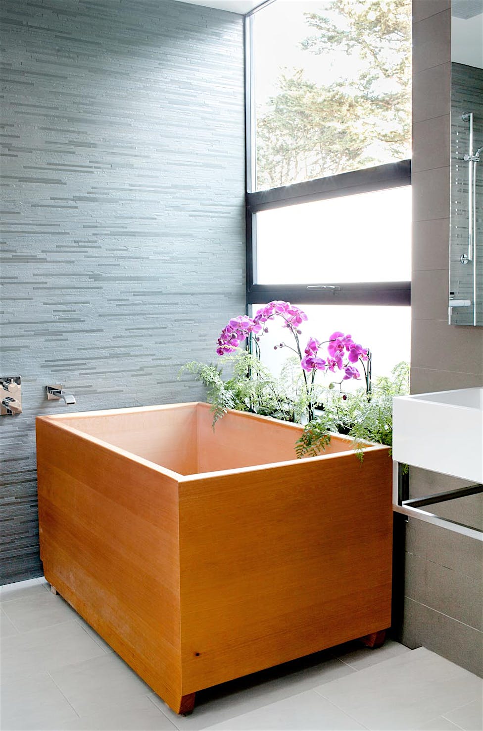 One such vacation inspired the tub, made of aromatic hinoki wood, in the master bathroom.