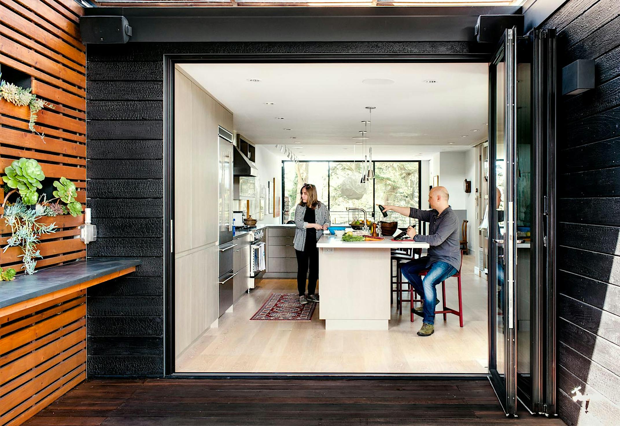 Announcing the home’s new chapter is a midnight-black facade, composed of cedar boards that were charred using the ancient Japanese art of shou sugi ban. The couple researched the technique exhaustively, and even considered doing it themselves, before Azevedo convinced them to outsource the job to a Texas studio, Delta Millworks. Overall, they took pains to obtain things locally, from the bathroom tile, courtesy of Heath Ceramics, to the Internet access, provided by San Francisco firm Monkeybrains.