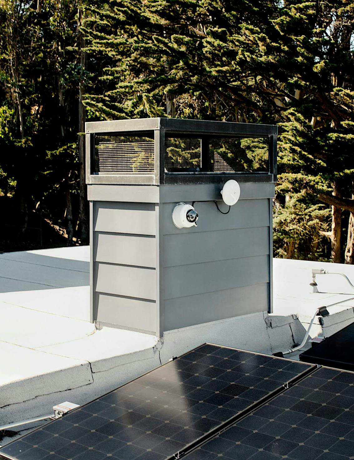 The data-driven home makes way for some more fanciful gizmos, too. Most notably, a video camera is mounted to the chimney and wired to deliver a livestream of the surrounding East Bay to a television indoors. Regina, who was inspired by a periscope Le Corbusier once placed atop a Paris apartment, calls it their “digital window. When the city’s veil of fog lifts, it’s possible to see all the way to Mount Diablo in Contra Costa County from their sofa.