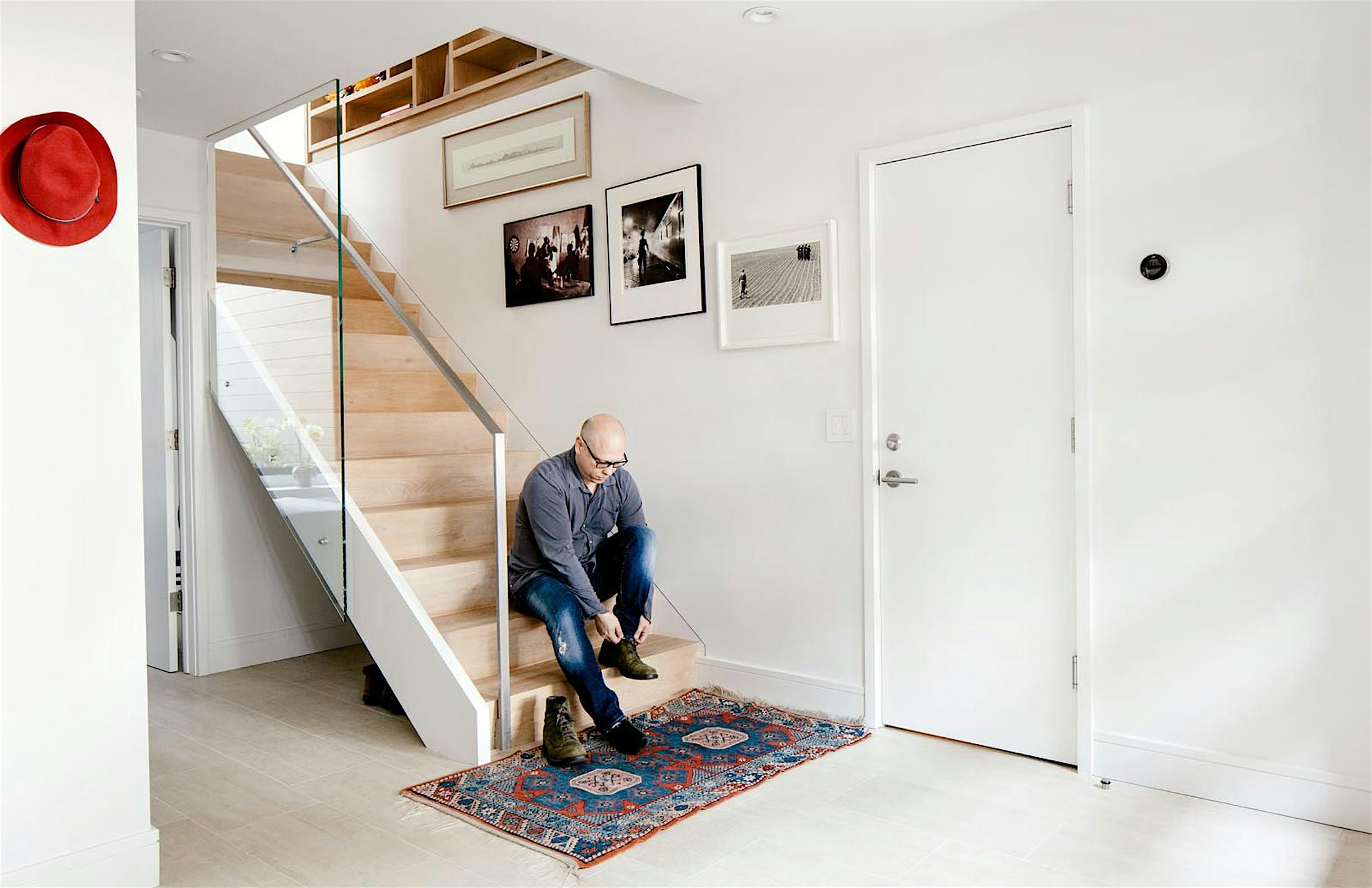 A glass panel was placed along the stair banister to create a transparent pathway for light to travel down from the second-floor skylight. Otherwise, Azevedo left the staircase mostly untouched, a rare exception in her to-the-studs renovation.