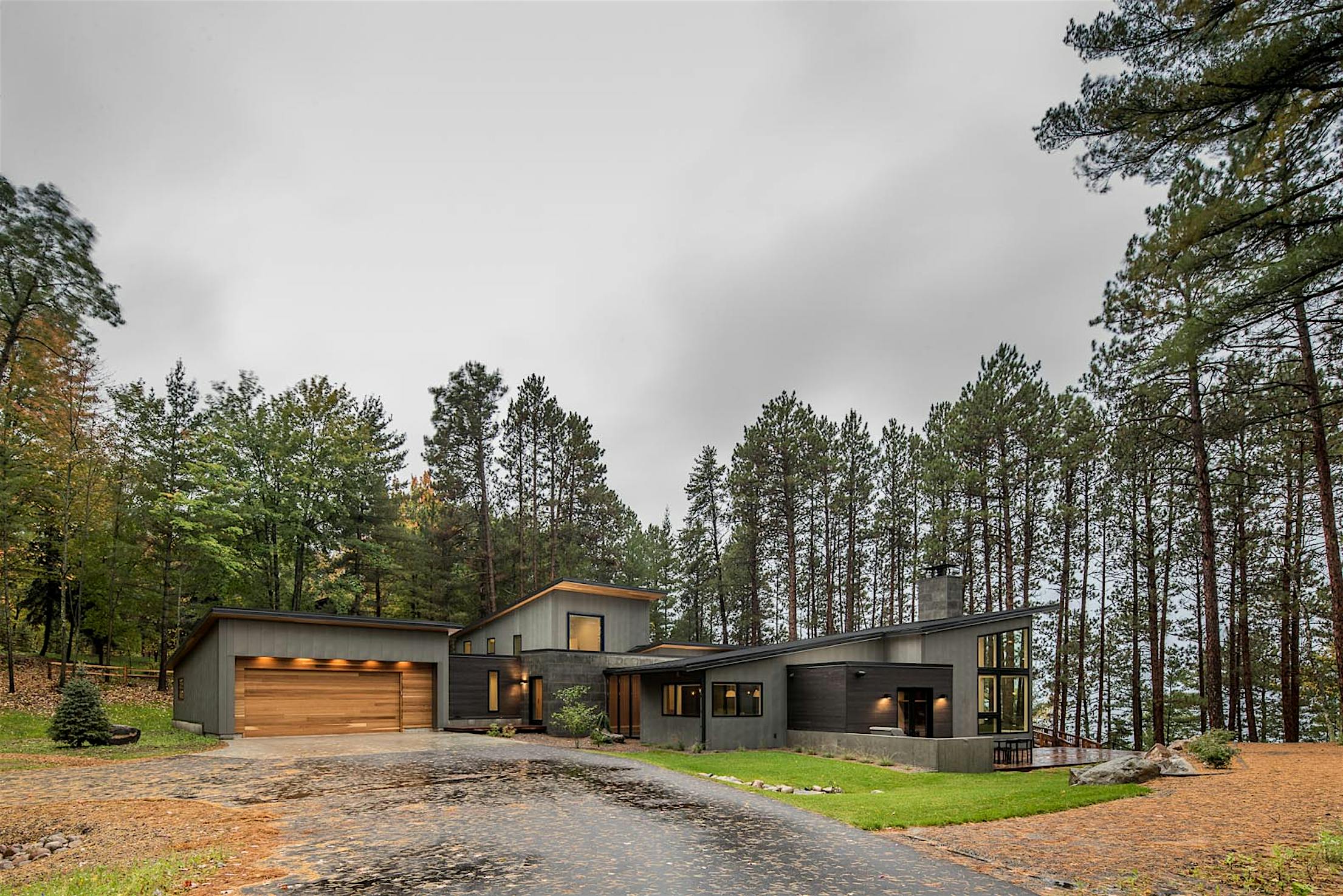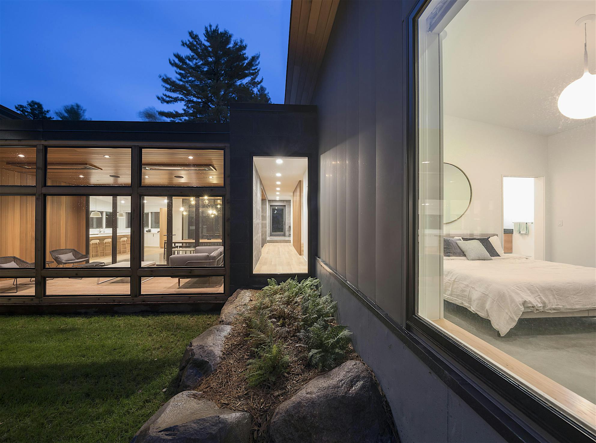 The 4800 square foot home is composed of two primary massings separated by a glass core. Splaying out to the lake beyond and nestled into a natural swale, the public spaces contour along the landscape, blurring the distinction between its built and natural environments. The voluminous living areas feature large walls of glass to welcome in the sometimes scarce northern light and capture intimate lake views through the embankment.
