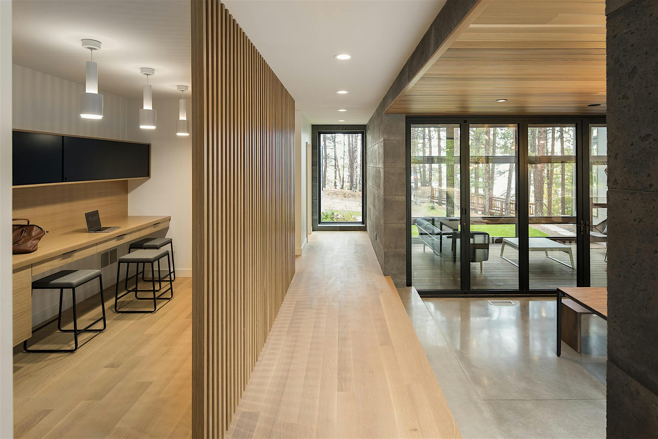 The glass core is formed in part by one NanaWall SL60 opening glass wall system. Upon opening, the system expands the glass core to combine the dining room and “the lounge,” forming a sheltered connection to the woods and lake beyond. The thermally broken, aluminum folding panel system includes a pair of French doors to accommodate effortless passage to and from the lounge even when closed.