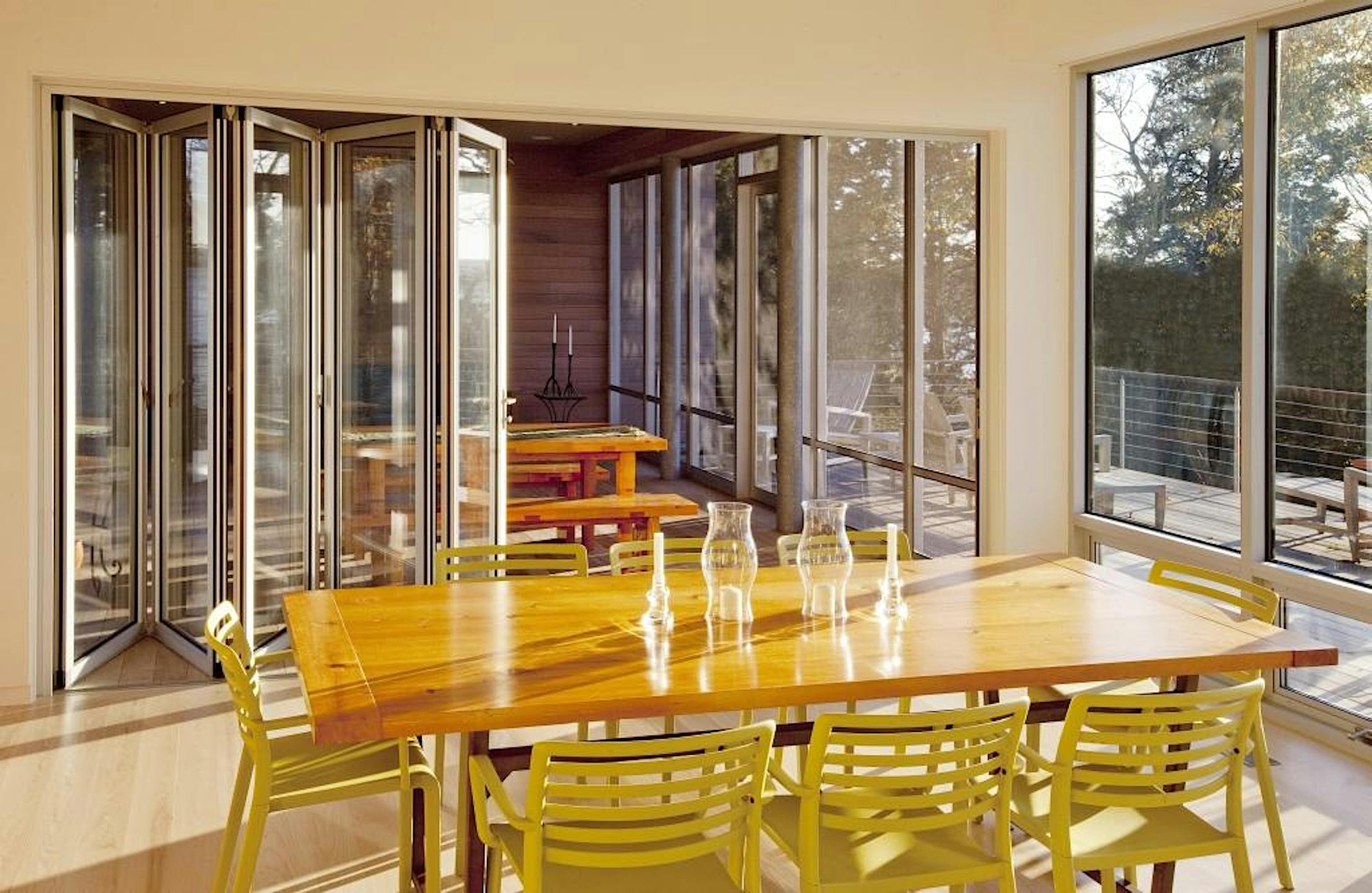 A unique application of the retractable screen is for a screened-in porch or outdoor patio protected from insects. This allows the screened porch to easily convert into an open porch in a matter of minutes. In this riverfront home designed by architect Will Ruhl, a NanaWall opens onto a screen porch, creating a combined sense of feeling between the indoors and the screen porch.
