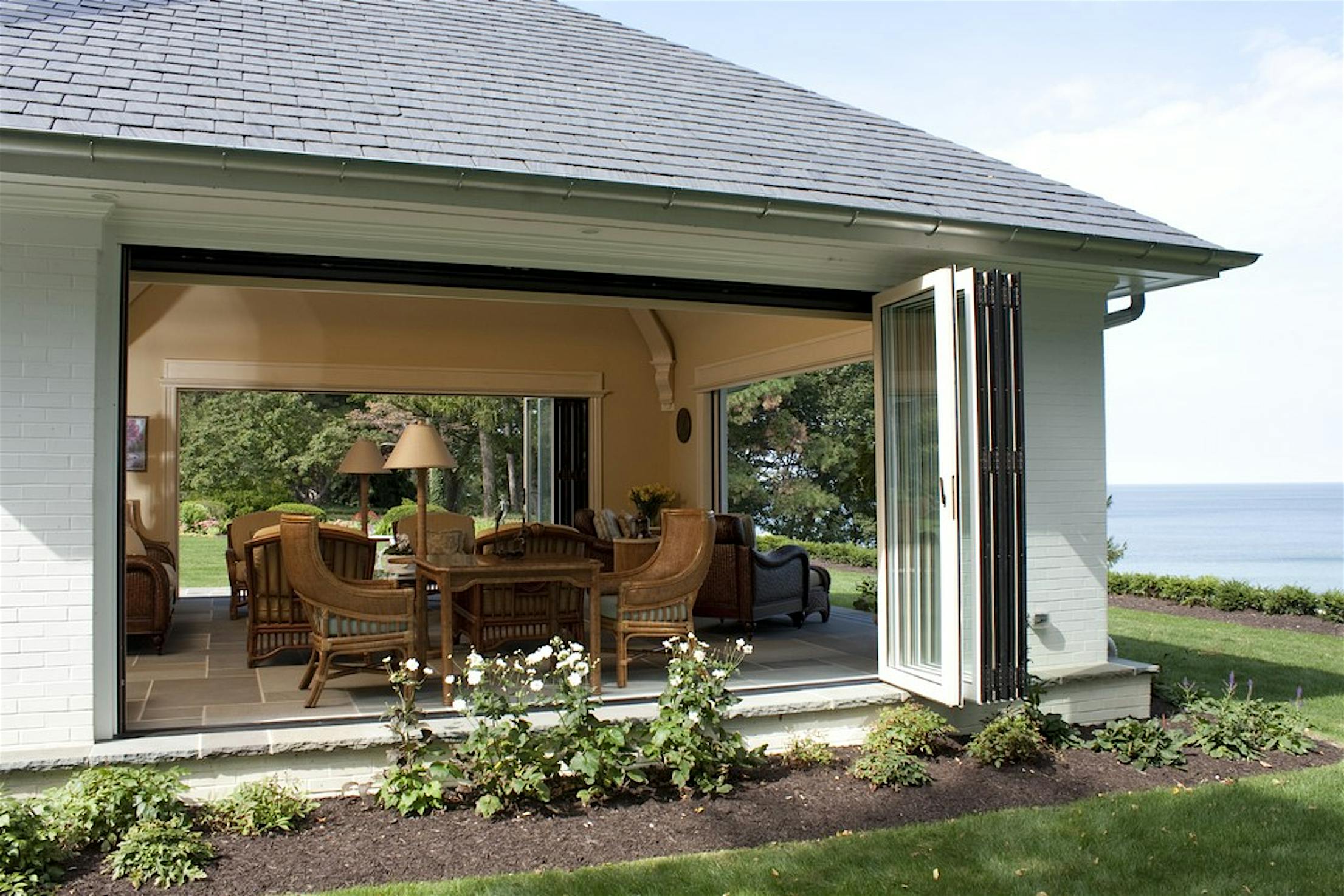 When homeowners from Rocky River, Ohio first met with architect firm The Arcus Group, they wanted to remodel their great room into a three-season room. They wanted the ability to open up to the outdoors during summer, to take advantage of beautiful lakefront views. The goal was to maximize their views of the lake with an open-air type porch.