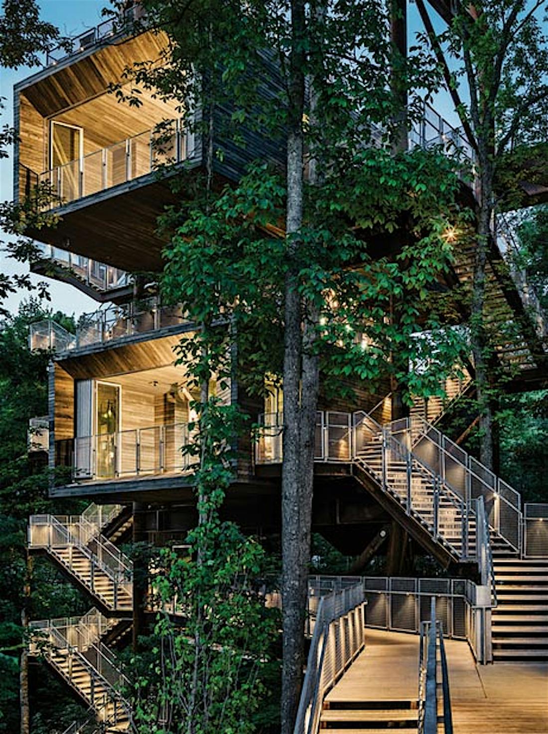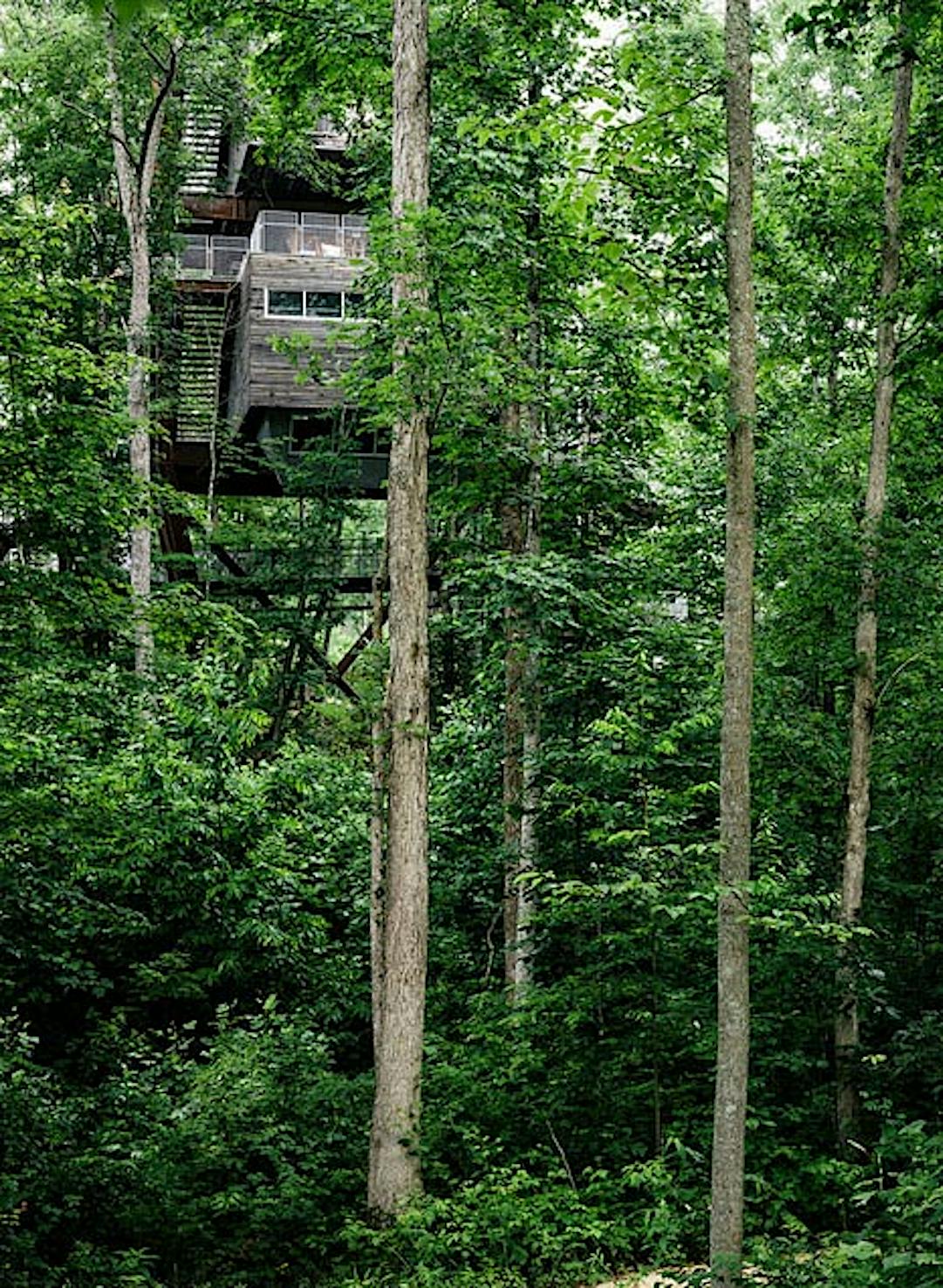 Mithun designed the tree house so that it would tread lightly on the land. The firm originally considered prefabricating the entire structure offsite but, in the research process, concluded that craning large modules into place would potentially harm the canopy. A combination of a bolted-together prefab structure and site-built wood housing yielded the least intrusive construction option. The Summit Bechtel Reserve is located in West Virginia's coal mining country. The architects looked to the local structures—bridges, mining apparatus, and other industrial buildings—to inform the tree house's design. A 166-ton Cor-Ten steel megastructure supports the 125-foot-tall building. The use of regionally appropriate materials, like steel and black locust wood, was important to the architects.