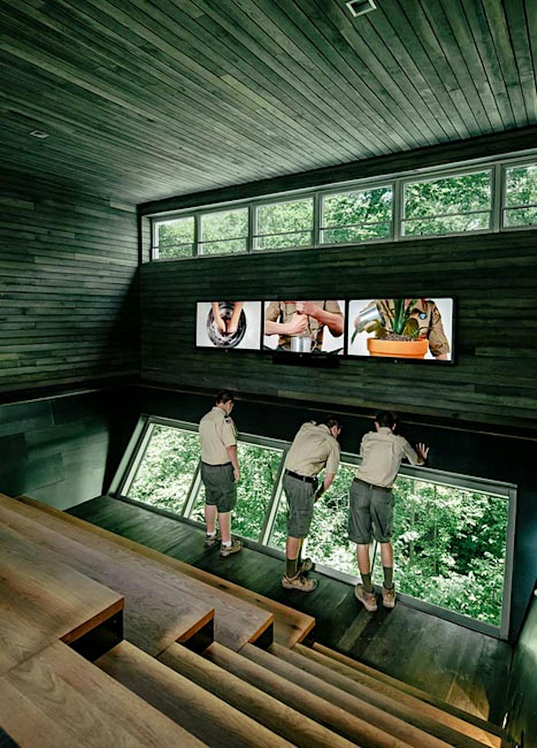 Mithun wanted to engage the scouts with all elements of the forest: the floor, the canopy, and a perspective above the tree tops. In one of the viewing rooms, visitors get the feeling of being fully surrounded by leaves.