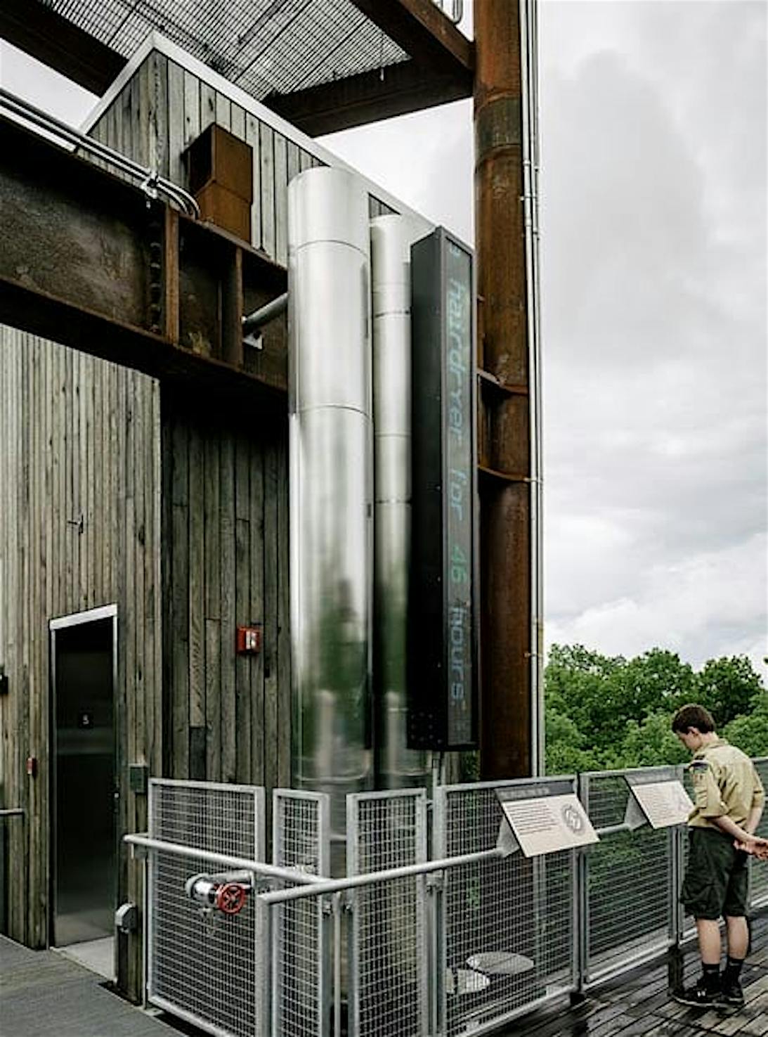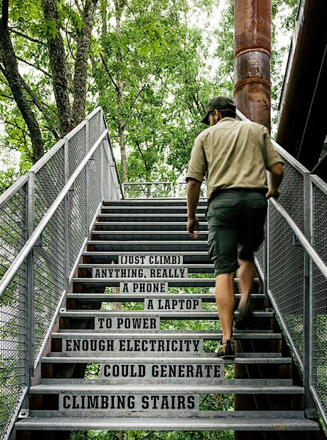 Visitors scale a series of outdoor staircases that wind their way up the structure. Volume and Studio Terpeluk turned the risers into a teaching moment about energy use and the impact of every day activities.